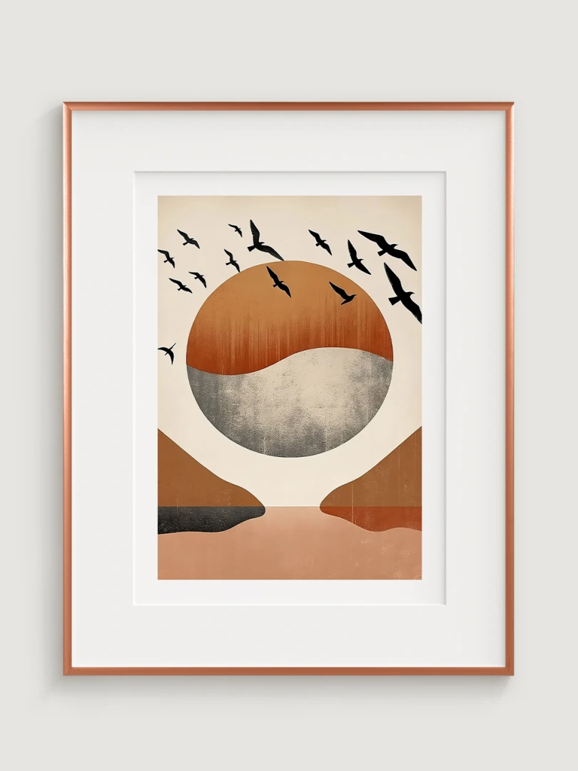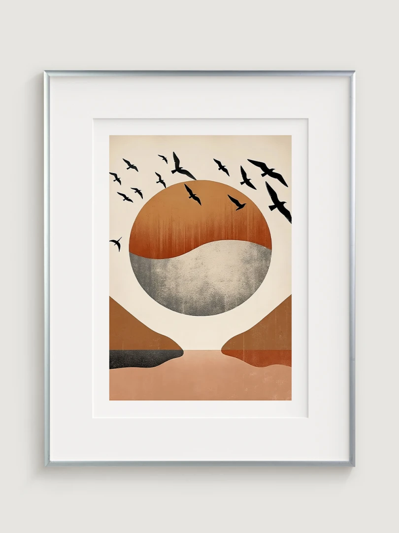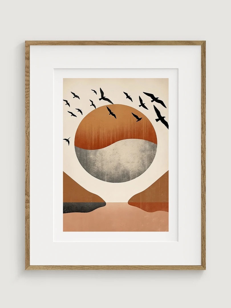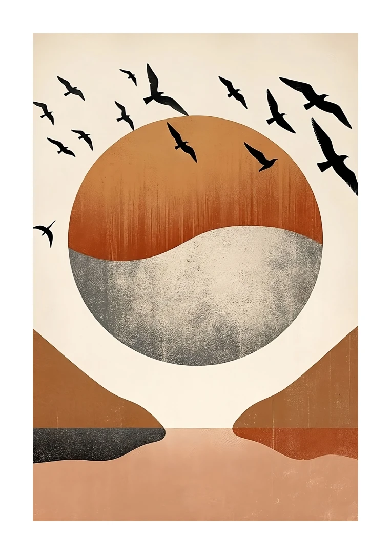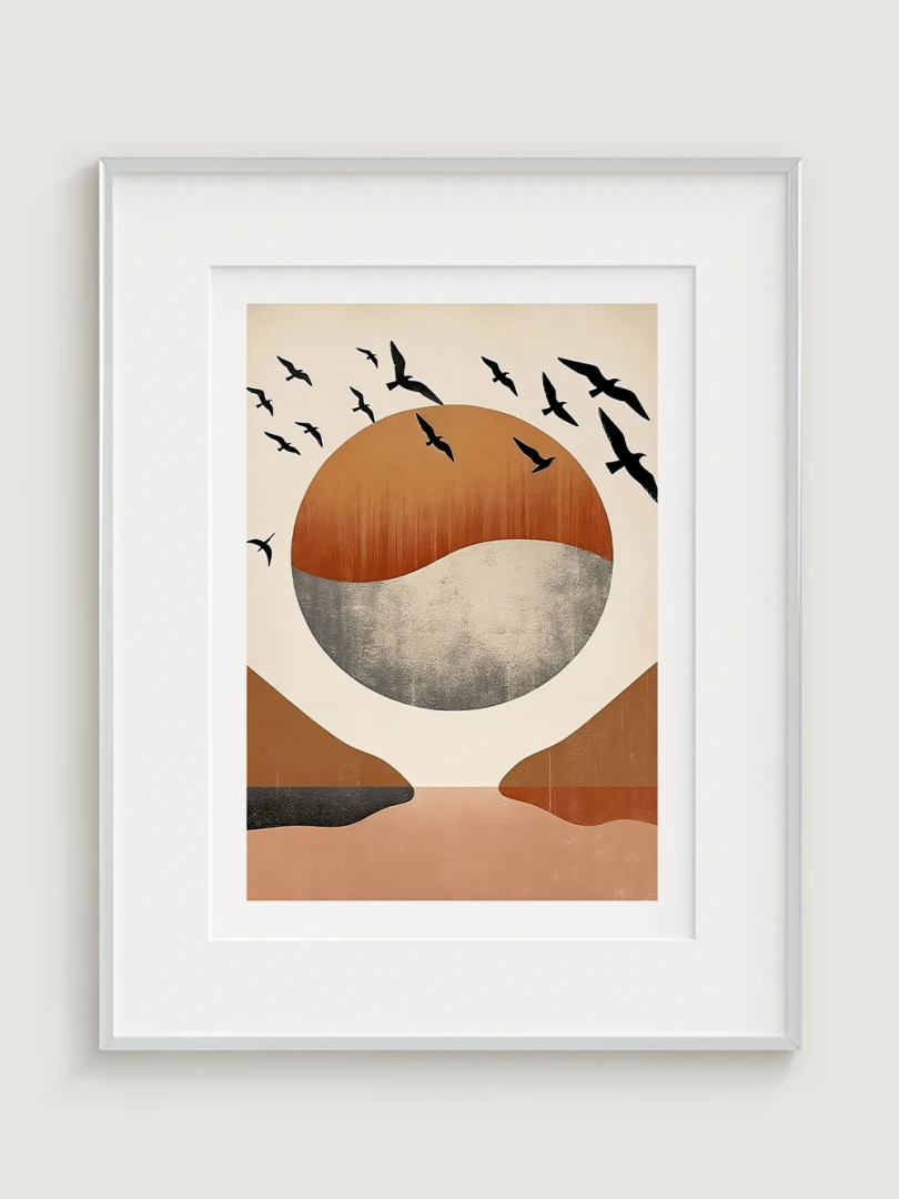 The highlight of this print is the flock of birds in flight, elegantly silhouetted against the backdrop, adding a dynamic sense of movement and freedom. These birds transform the artwork from a simple landscape into a vivid portrayal of life and energy, inviting the viewer to ponder the beauty of untamed nature and the grace of these creatures.