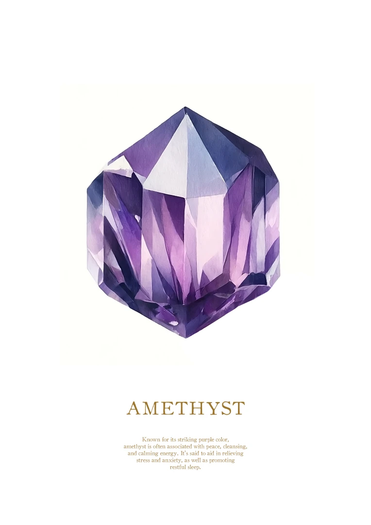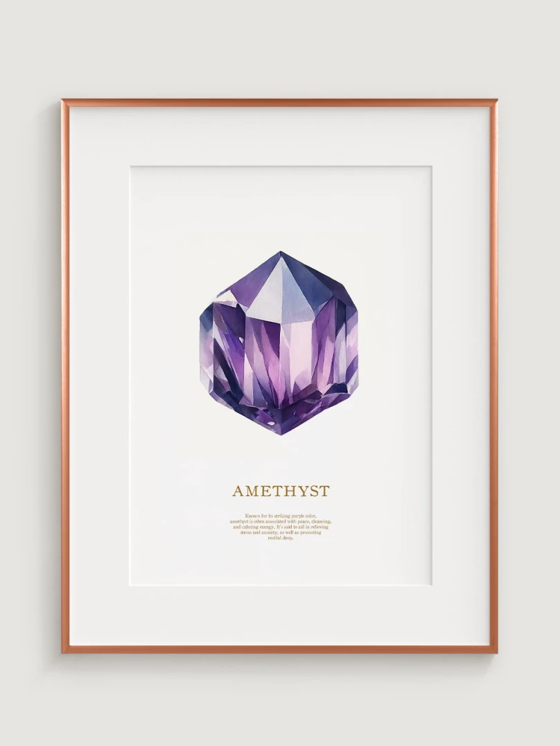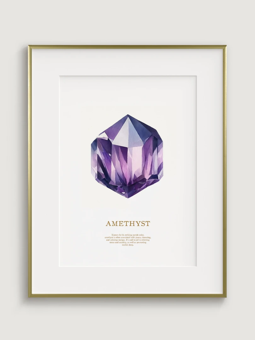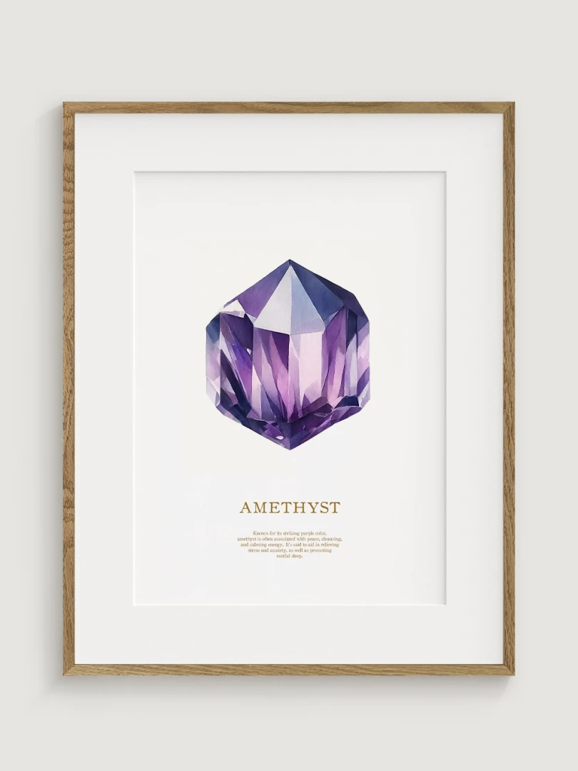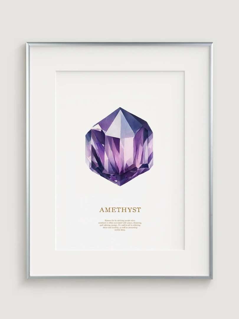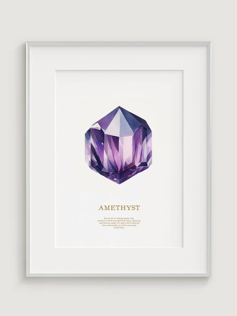 This striking print depicts the cool, violet tones of amethyst, which is known for its calming and spiritual properties. Perfect for adding a touch of serene elegance to any room, this print captures the stone's purported abilities to bring harmony and inner peace.