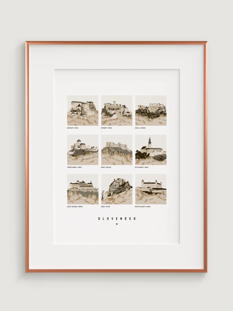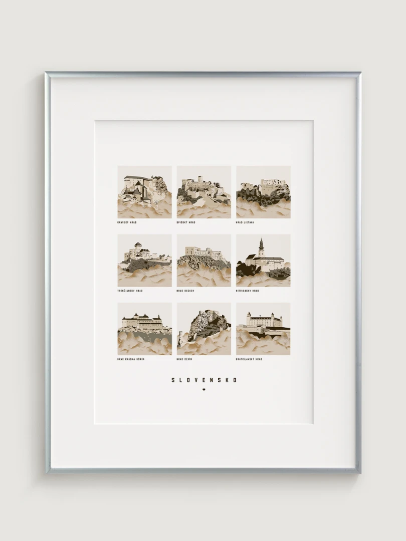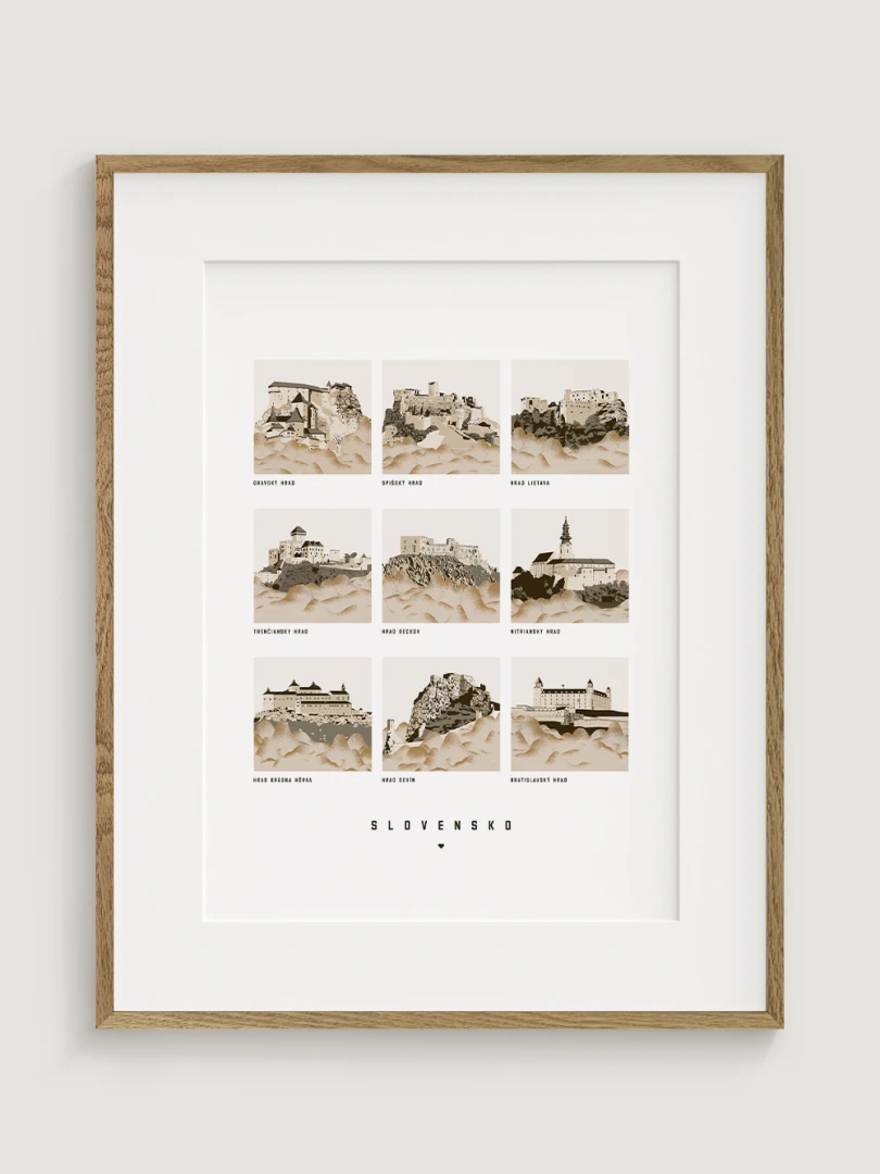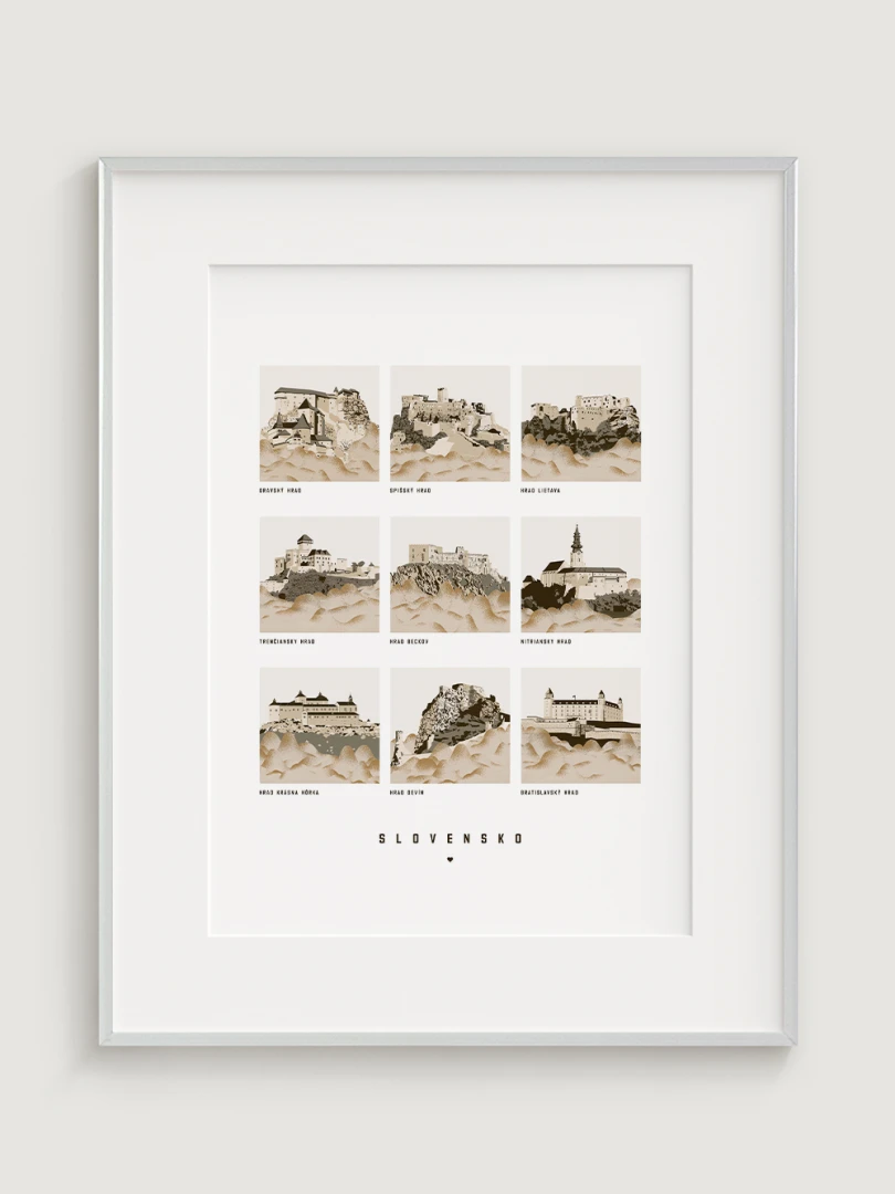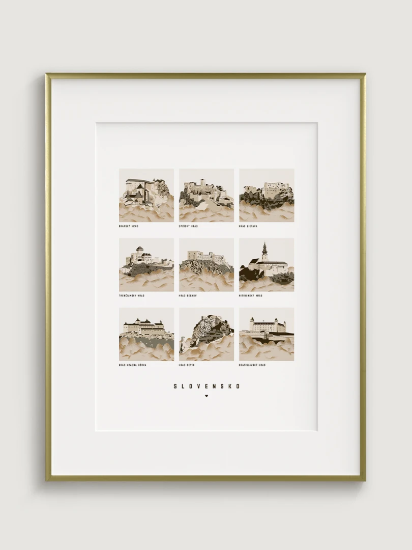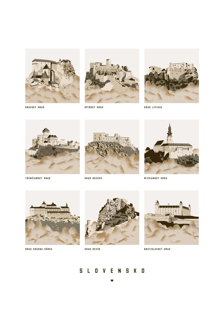 This print beautifully captures the architectural elegance and historical significance of each castle in a series of detailed sepia-toned illustrations, providing a window into the past and celebrating Slovakia's cultural heritage.