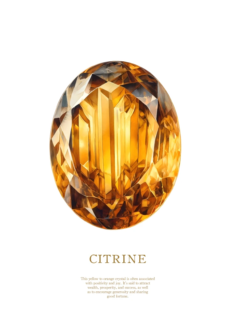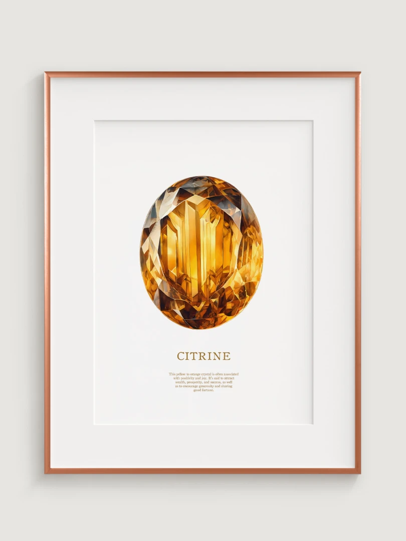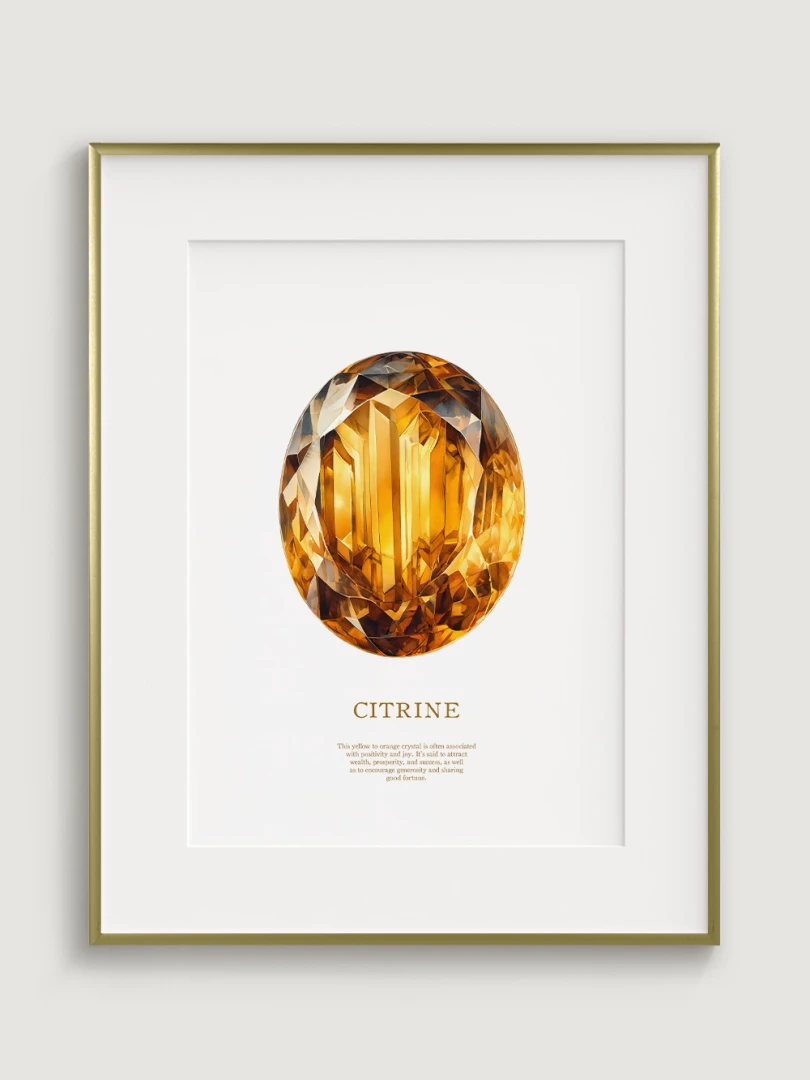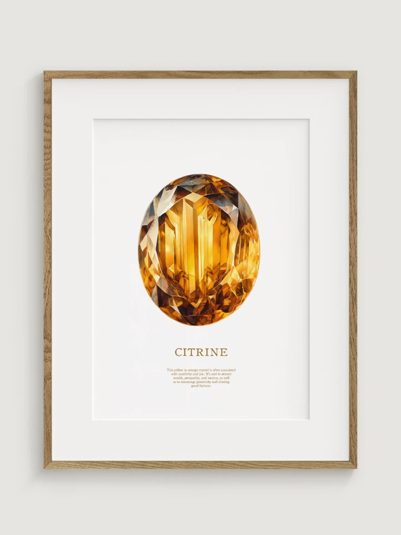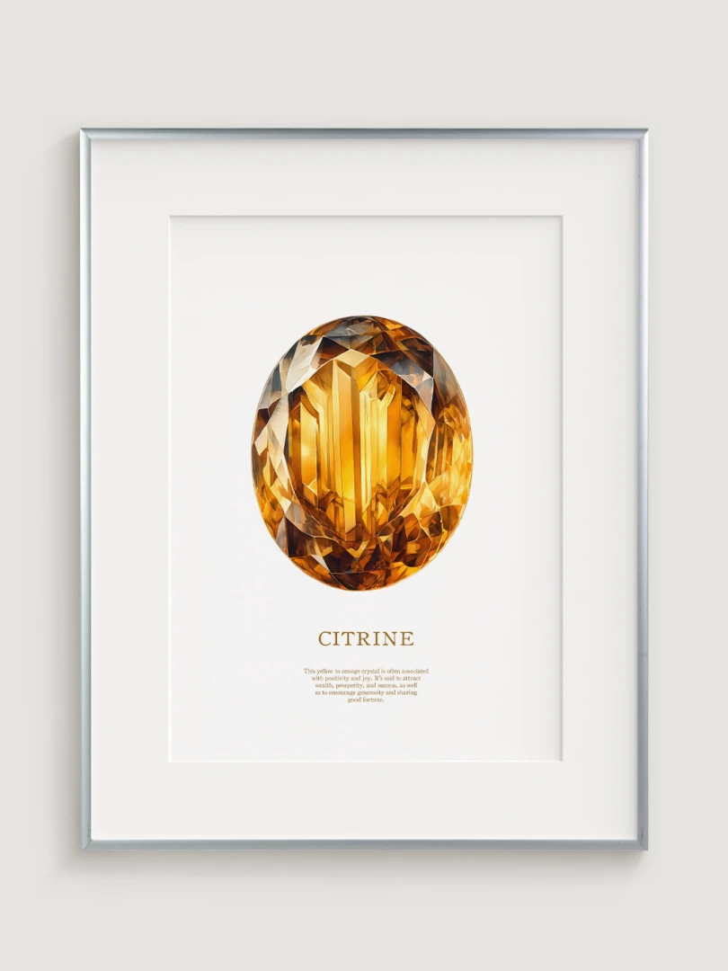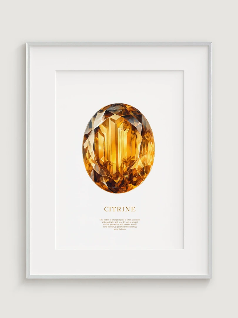 This print captures the vibrant yellow to orange hues of citrine, a gemstone celebrated for its positivity and joy-bringing properties. Known for attracting wealth, prosperity, and success, citrine is also believed to encourage generosity and sharing of good fortune.