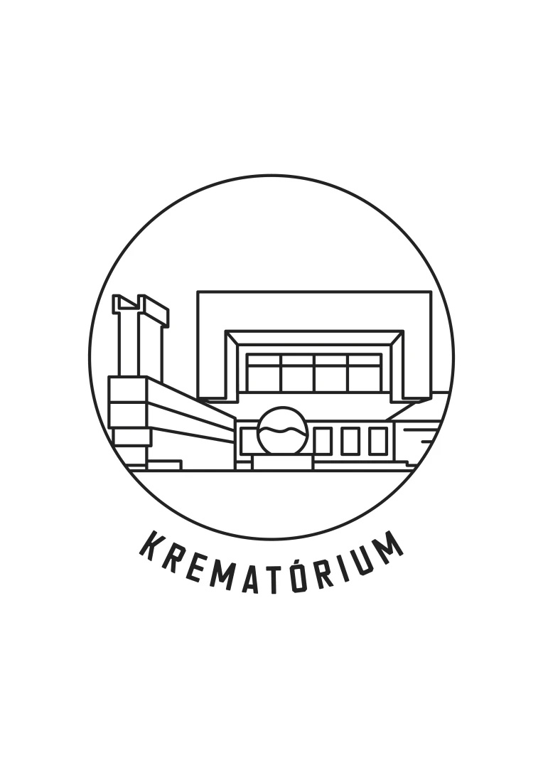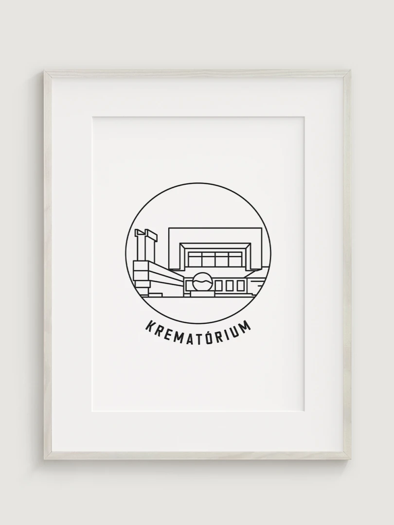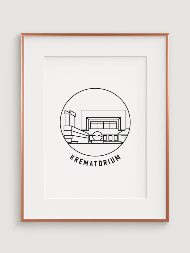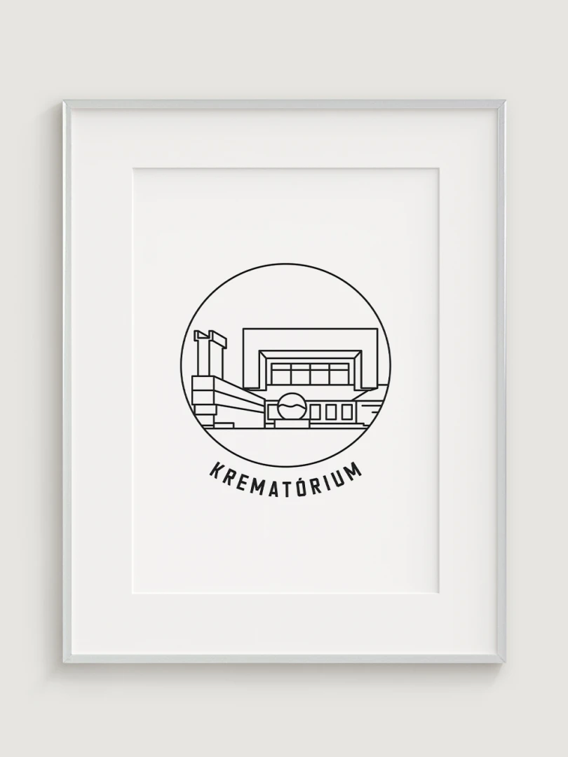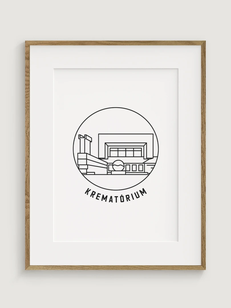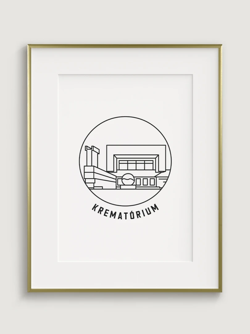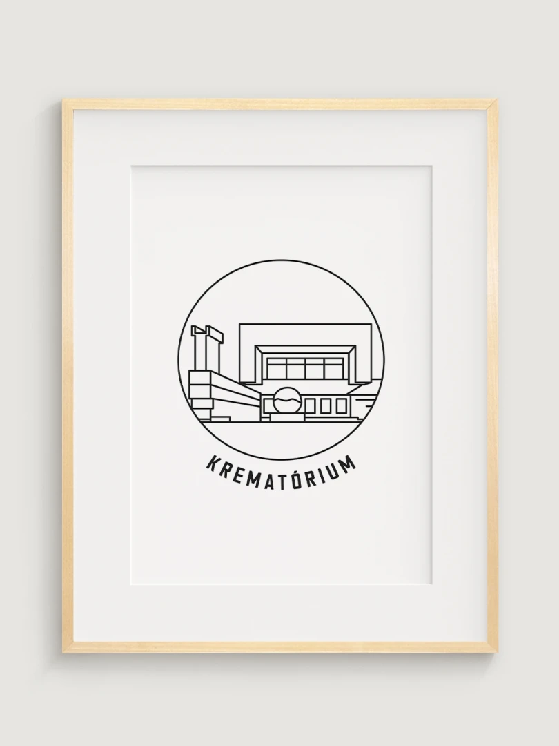 This print is a stylized, minimalist depiction of the Crematorium in Košice, a functionalist building with distinctive architectural elements. Elaborated with fine black line drawing on high quality paper, this illustration faithfully captures the unique forms of the building in a modern and timeless style.