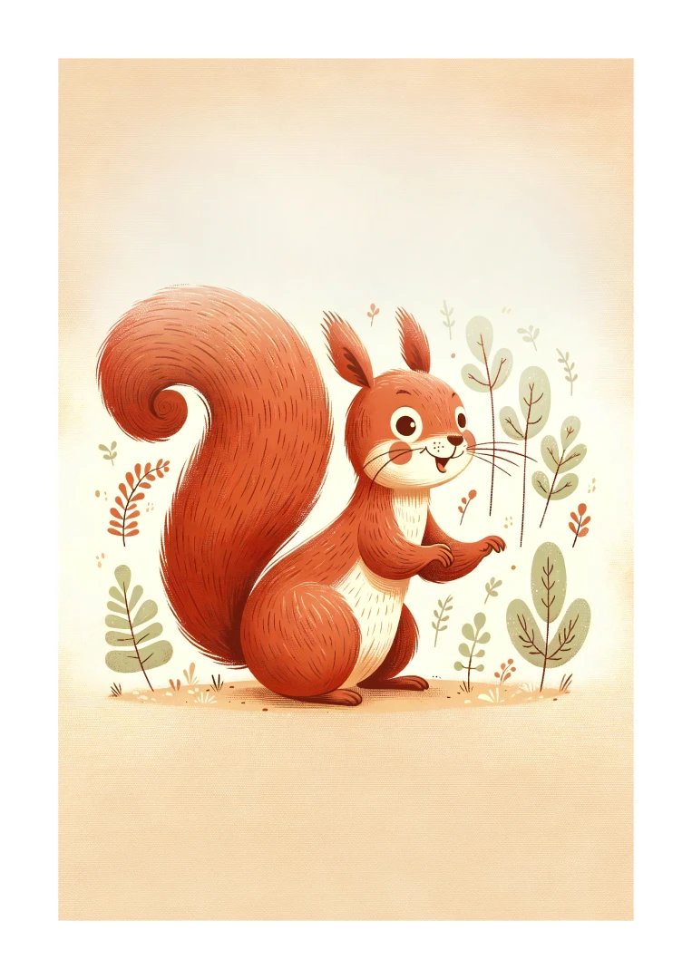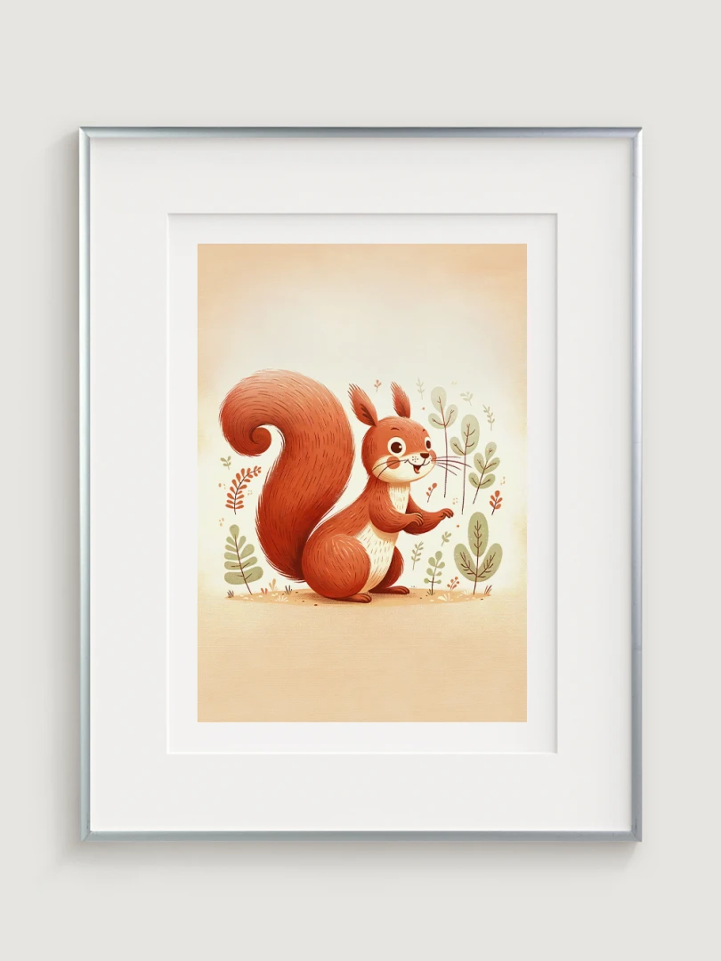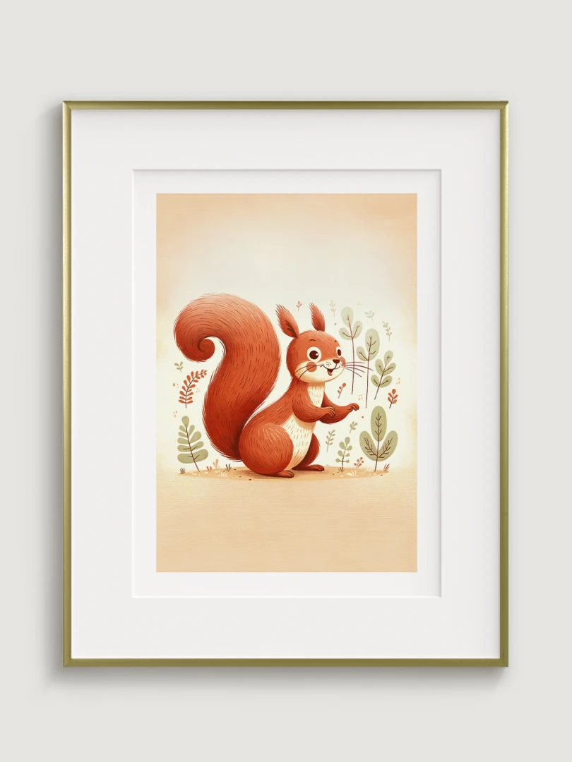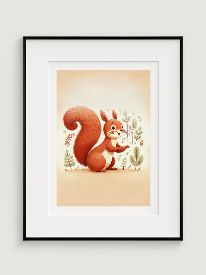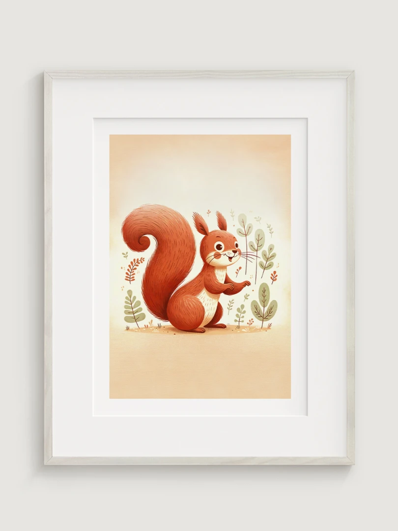 Gentle colors and soft, rounded shapes create a soothing and joyful atmosphere that's perfect for any room in need of a touch of whimsy. The squirrel's expressive eyes and cheerful posture bring life to the illustration, making it a heartwarming addition to both children's rooms.