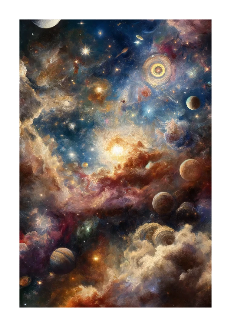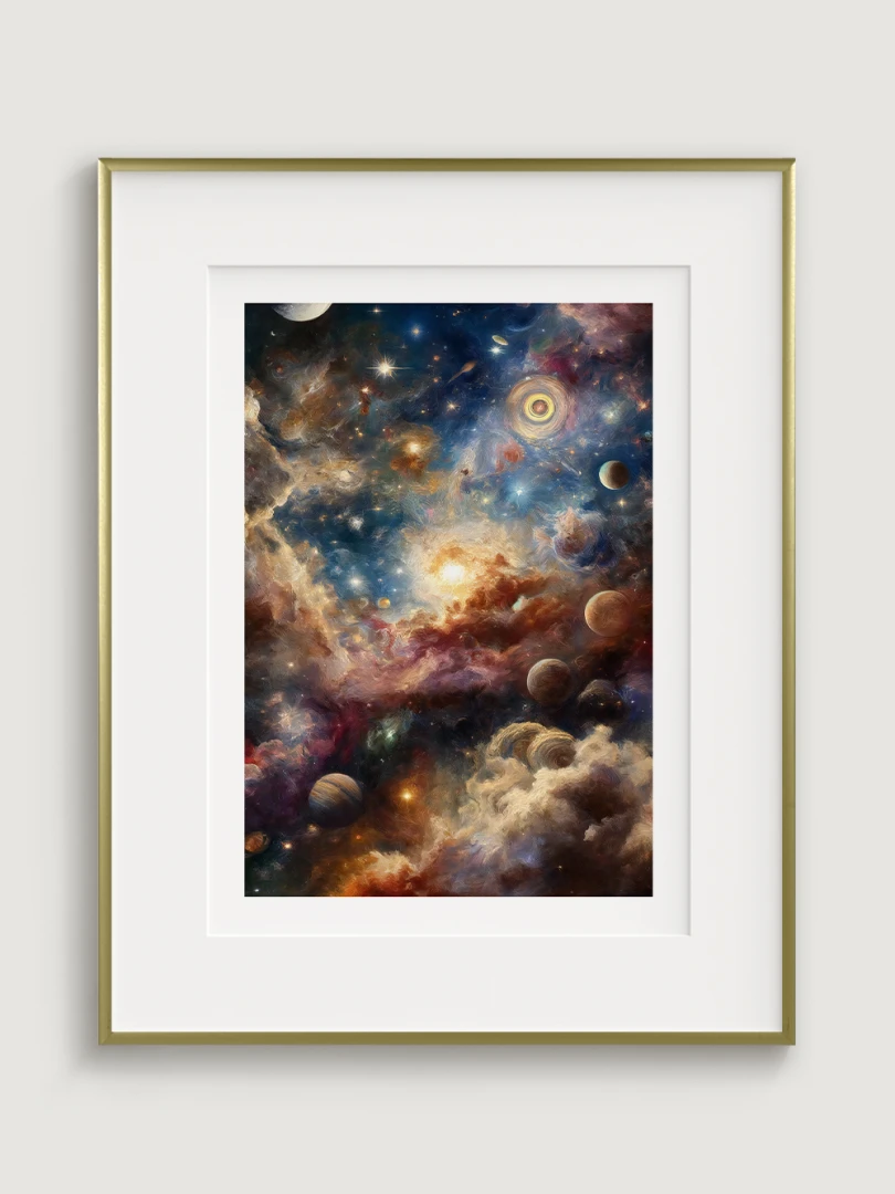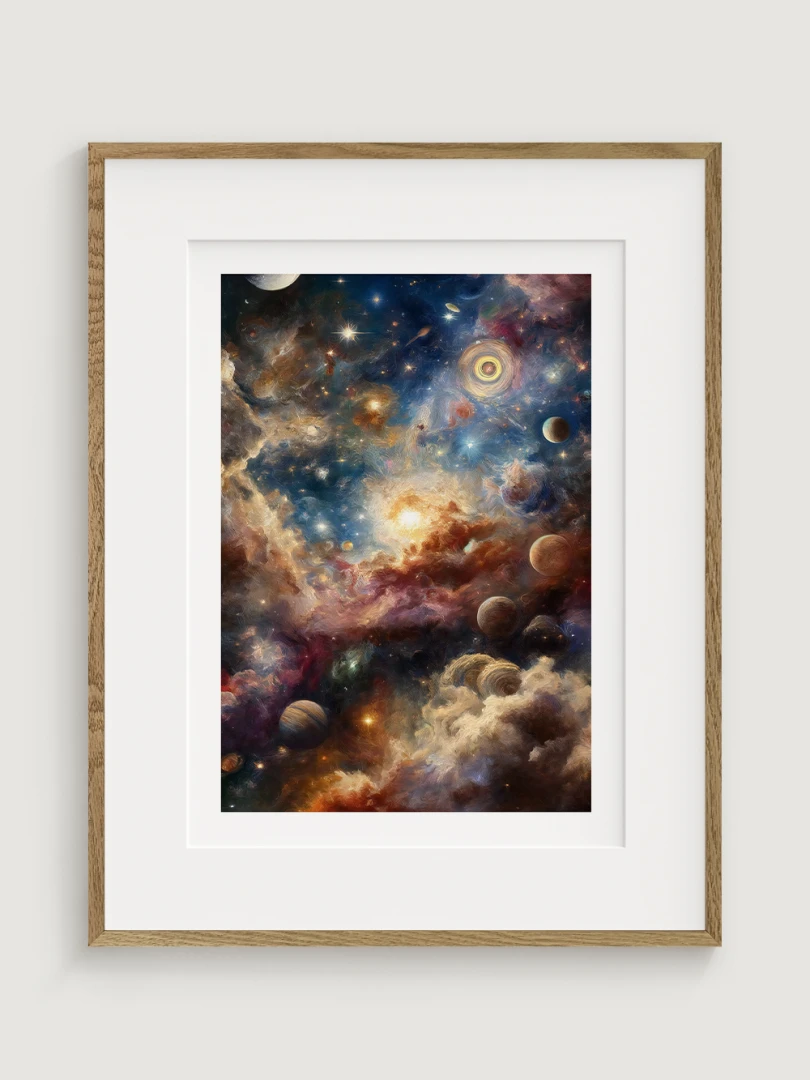 The print fits perfectly into modern and minimalist interiors, where its depth and colourfulness create an atmosphere of grandeur and dreamlike wandering into distant worlds. It is ideal for living rooms, offices, study rooms and children's rooms, where it can inspire to think about the universe and its mysteries. Science fiction lovers will appreciate this print for its ability to awaken the imagination and the sense of endless possibilities offered by the fascinating universe above us.