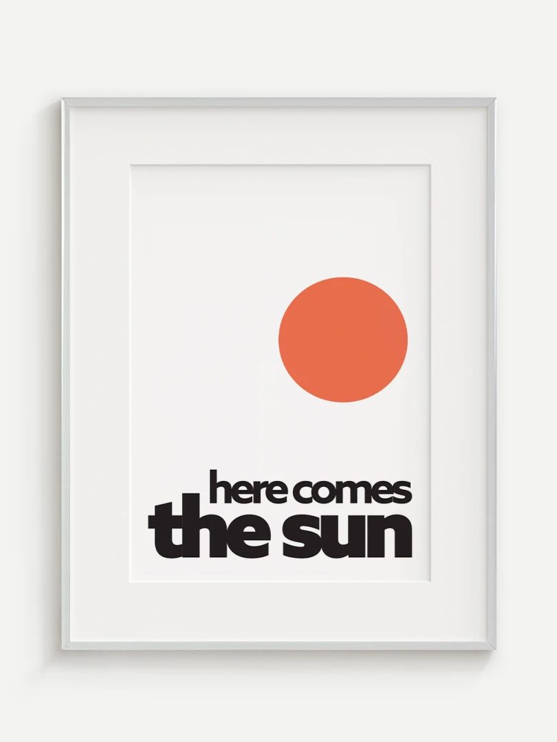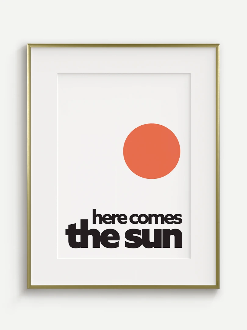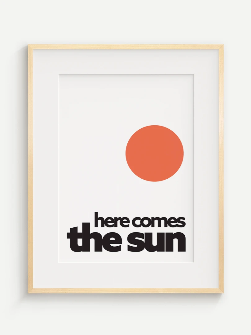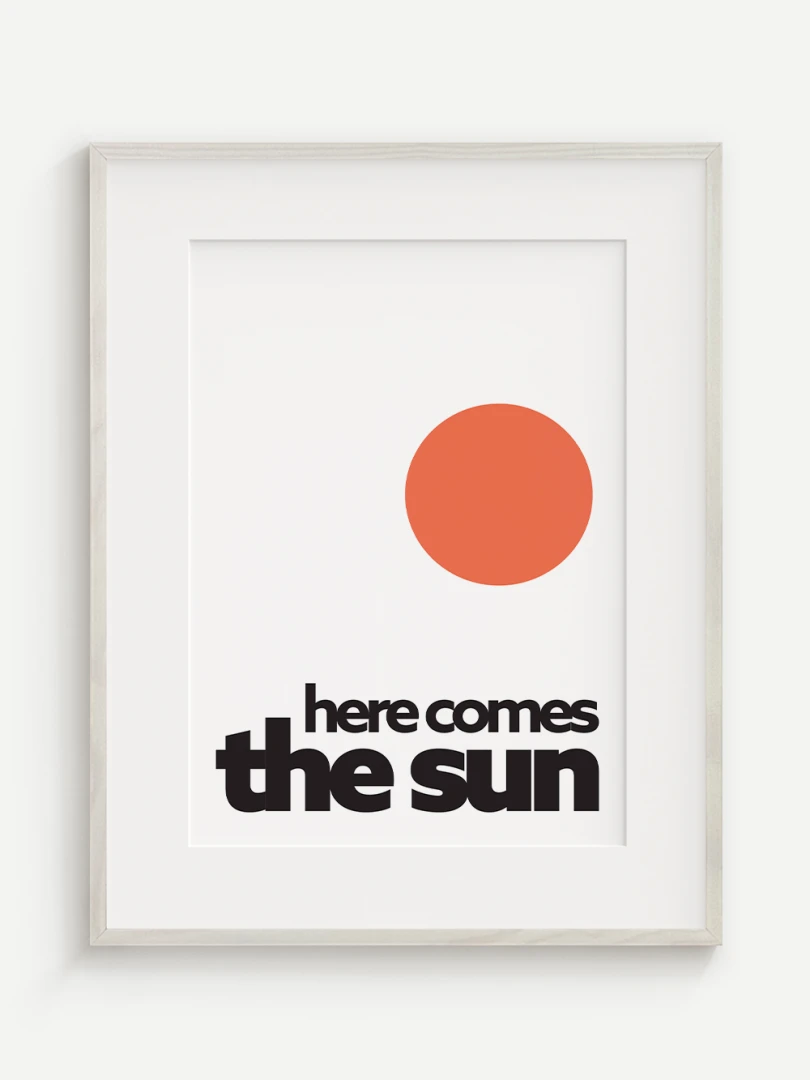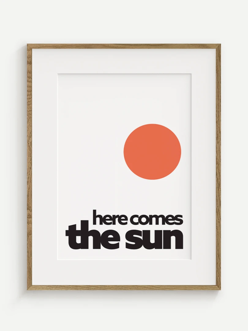 This artistic print brings positive energy and a touch of optimism to your space with the iconic "Here comes the sun". The minimalist graphic design with a vibrant orange sun and bold typography evokes a feeling of joy, warmth and new energy.