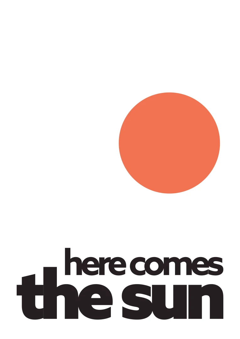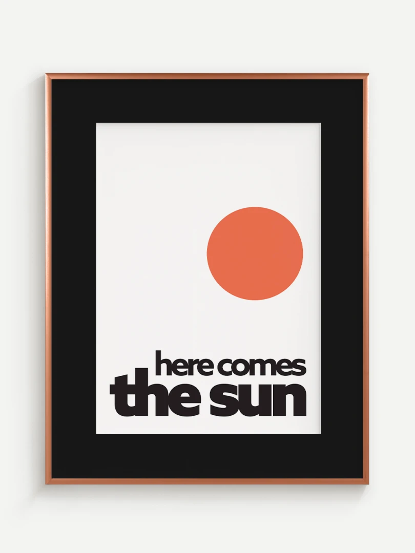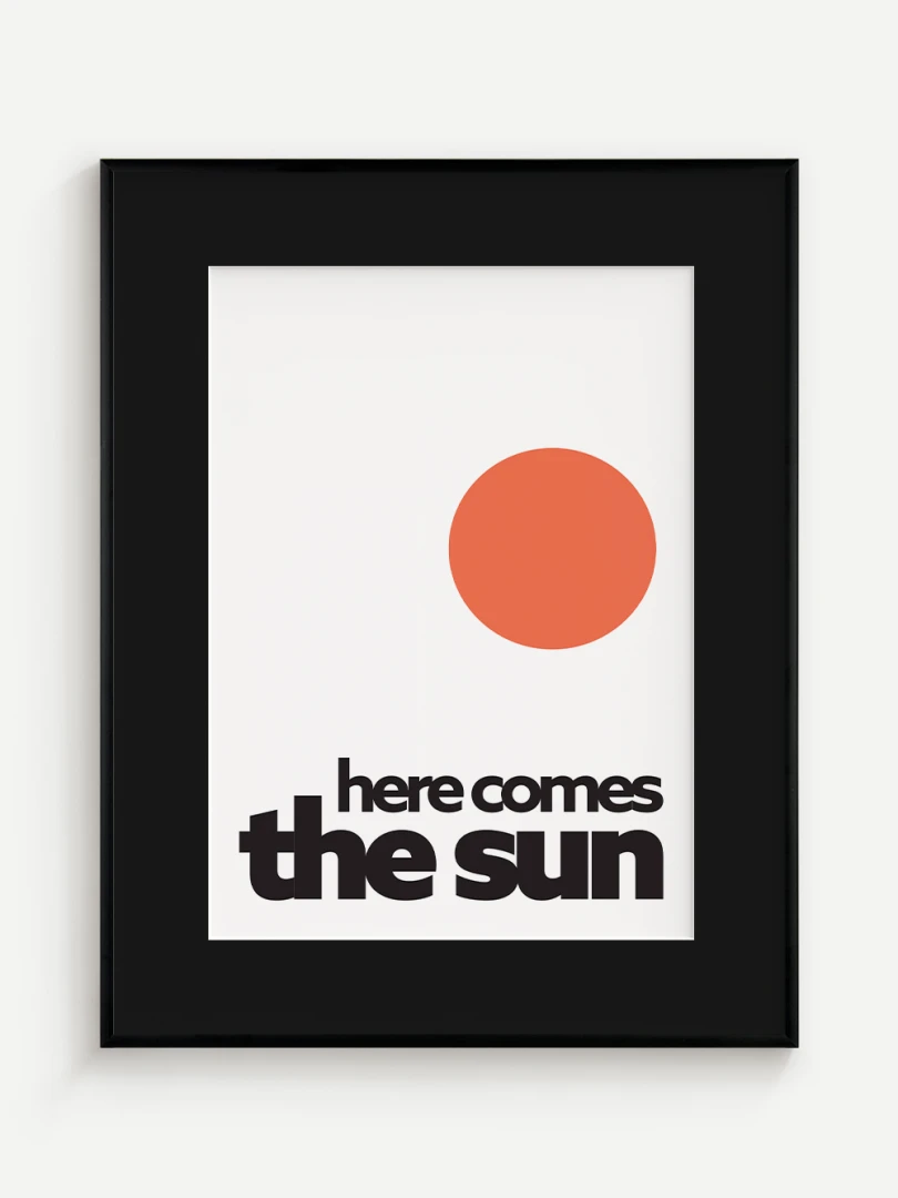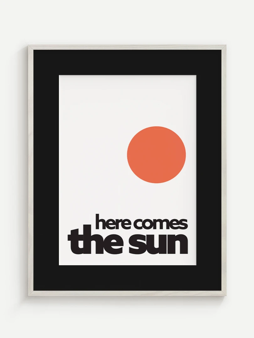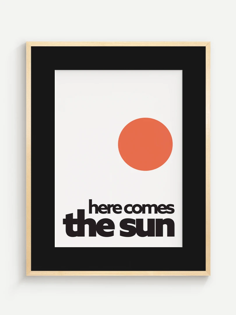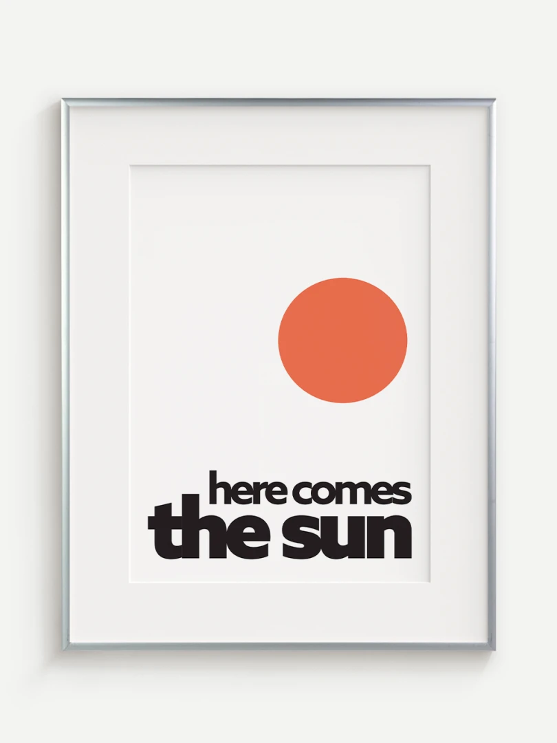 This artistic print brings positive energy and a touch of optimism to your space with the iconic "Here comes the sun". The minimalist graphic design with a vibrant orange sun and bold typography evokes a feeling of joy, warmth and new energy.