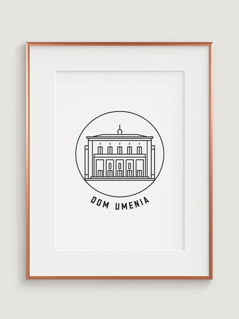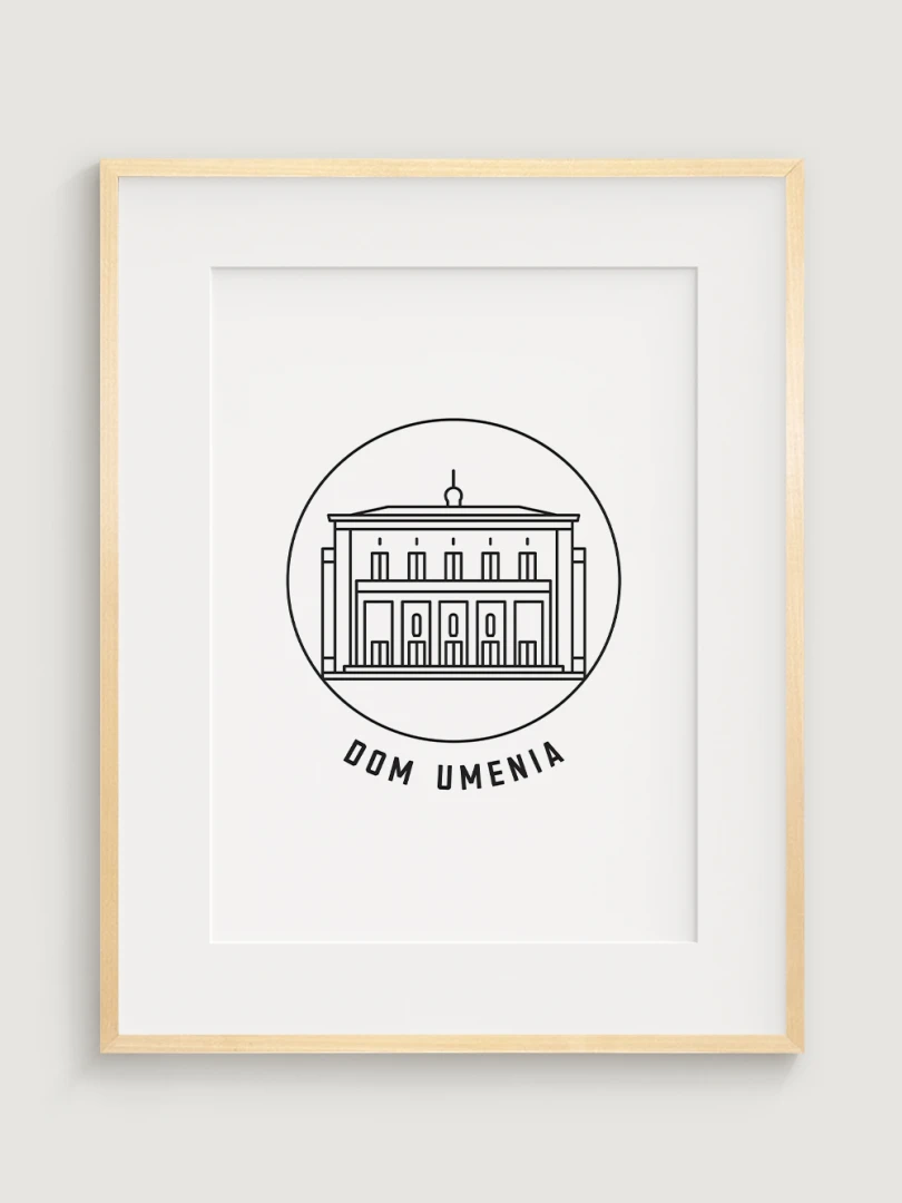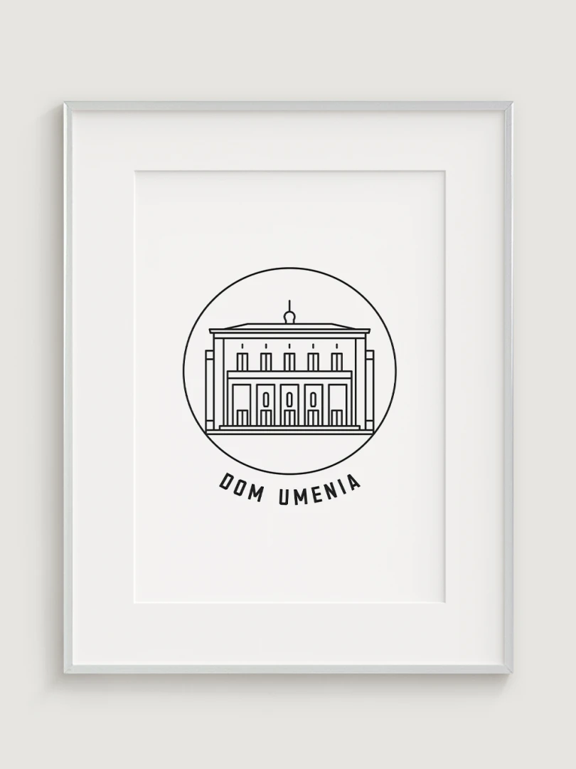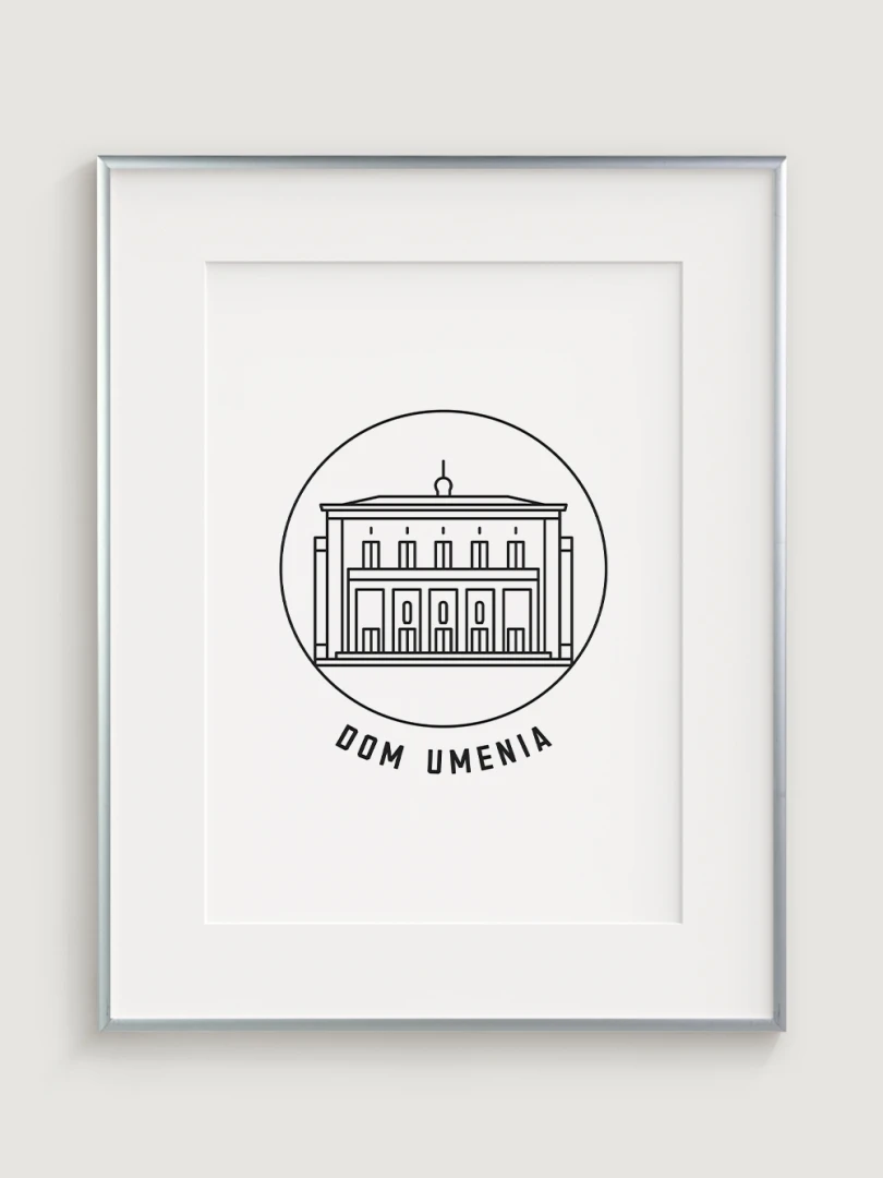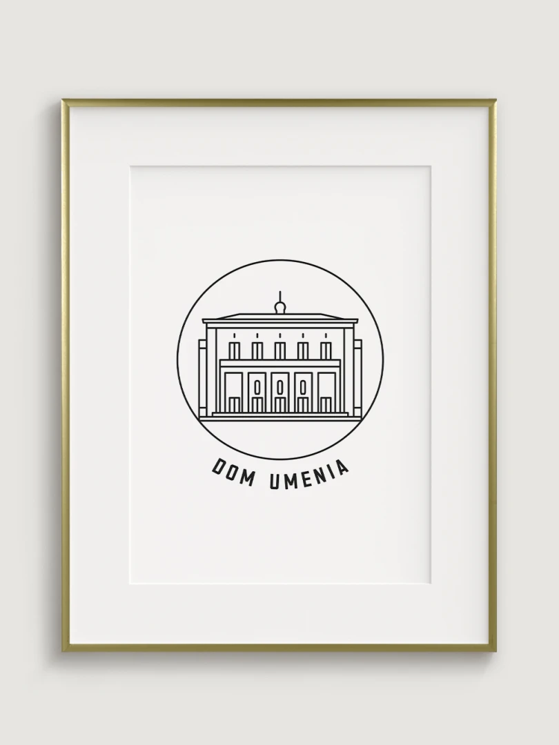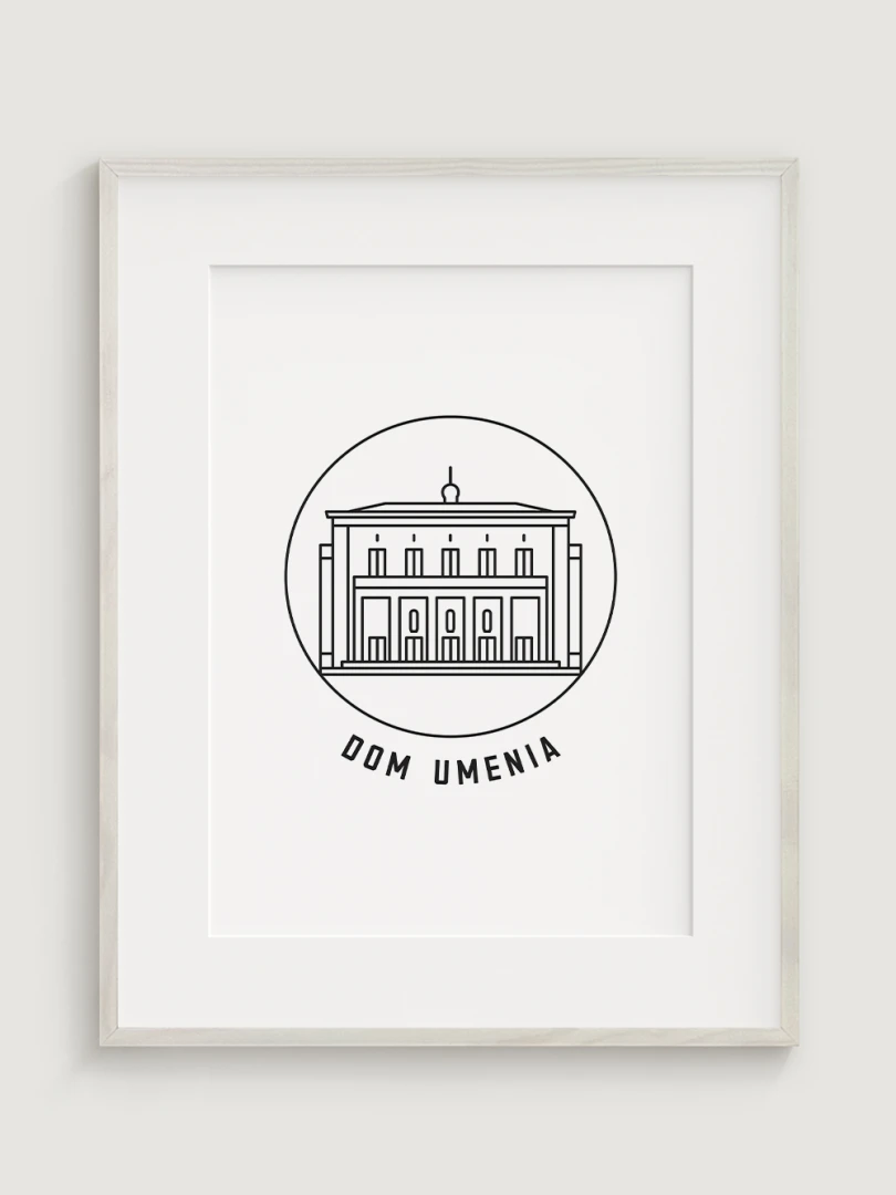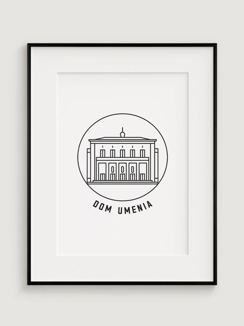 This print is a stylized, minimalist depiction of the House of Arts in Košice, an important building that combines modern architecture with cultural value. Elaborated with elegant black line drawing on high quality paper, this illustration captures the clean lines and original forms of the building in a timeless and contemporary style.