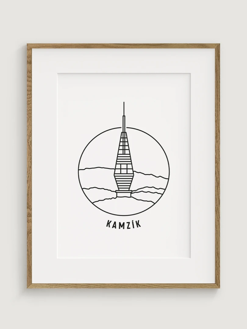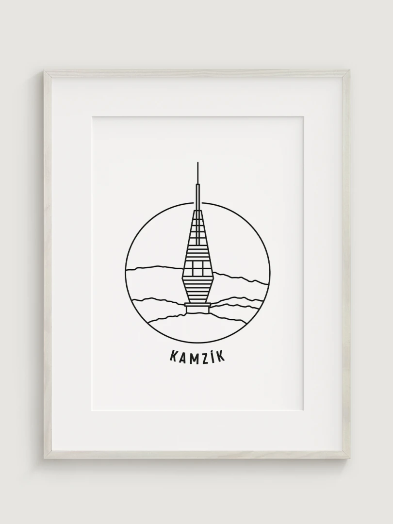 This piece captures the distinctive structure of the tower, set against the rolling hills that surround it, all enclosed within a simple circular border that focuses the viewer's attention on the iconic design.Whether for your home, office, or as a gift, this artwork brings a piece of Bratislava's contemporary architecture into any space in an understated yet striking manner.
