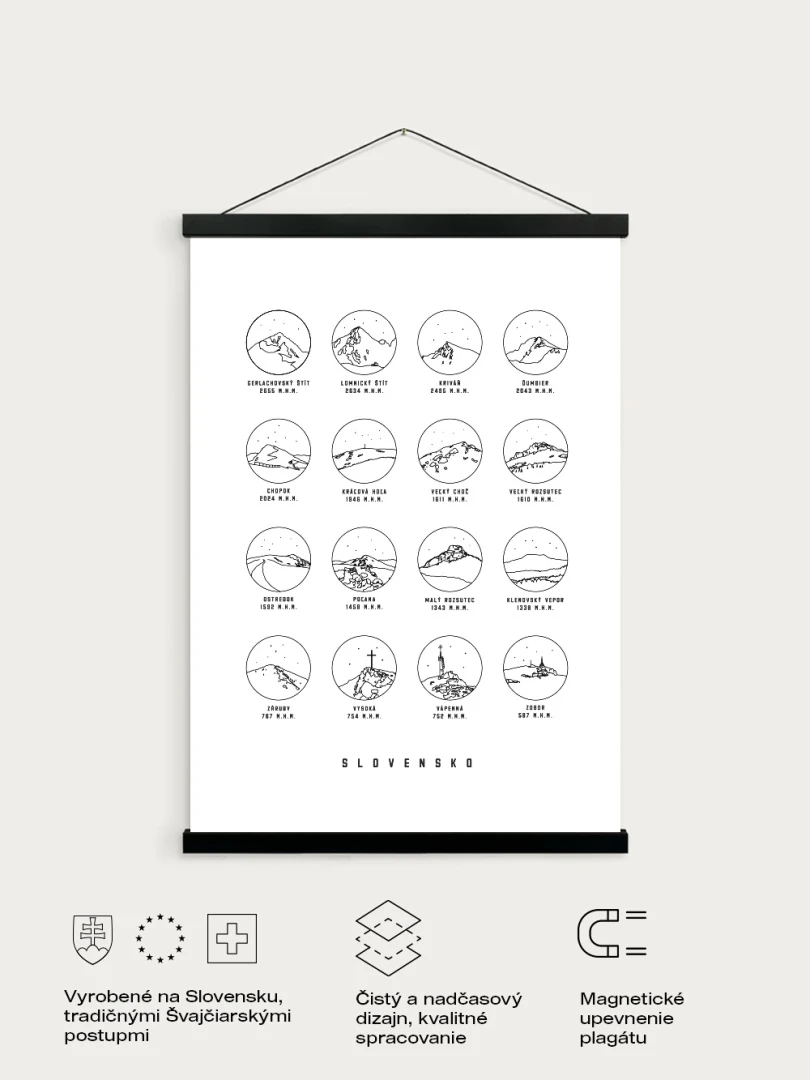 We bring you a simple solution for hanging prints or posters. The frame is made up of matt wooden slats, which hold the poster/print together thanks to small magnets in each slat. A lanyard attached to the top back rail is used for hanging.