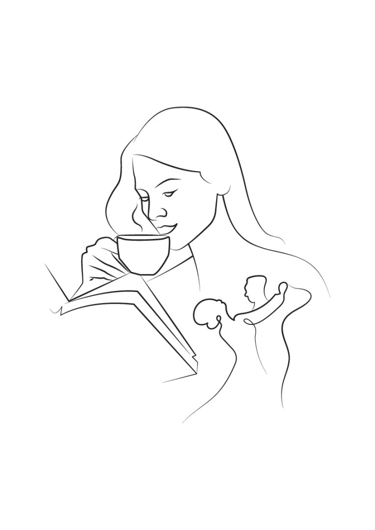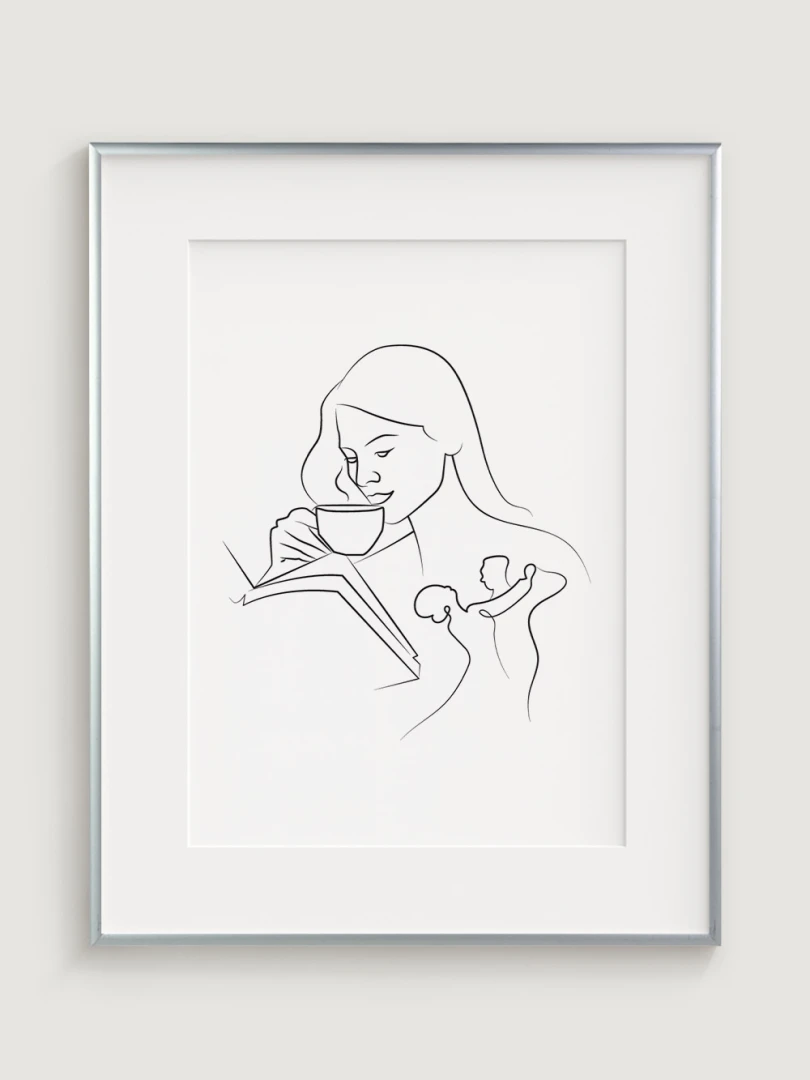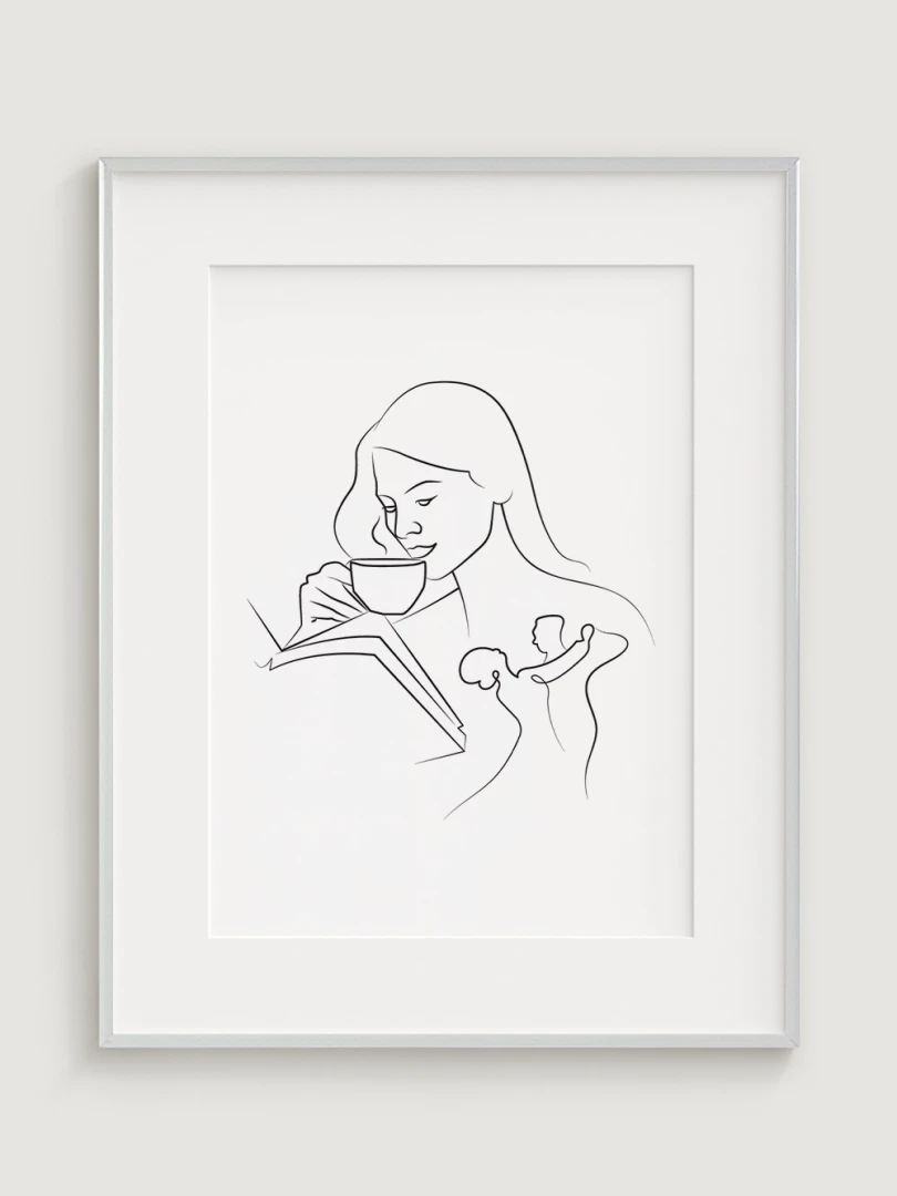 This piece uses simple, clean lines to depict the figure of a woman, her face softened by a gentle smile as she holds a cup close, suggesting a moment of quiet reflection or a peaceful break in her day. The artwork's elegance lies in its simplicity, allowing the viewer to fill in the details with their imagination.