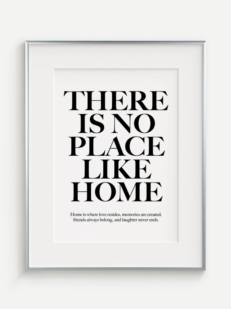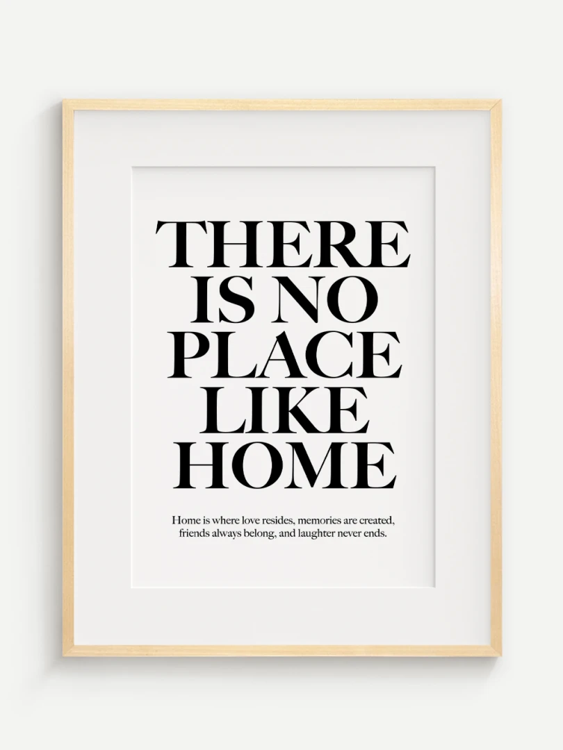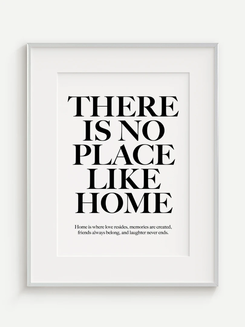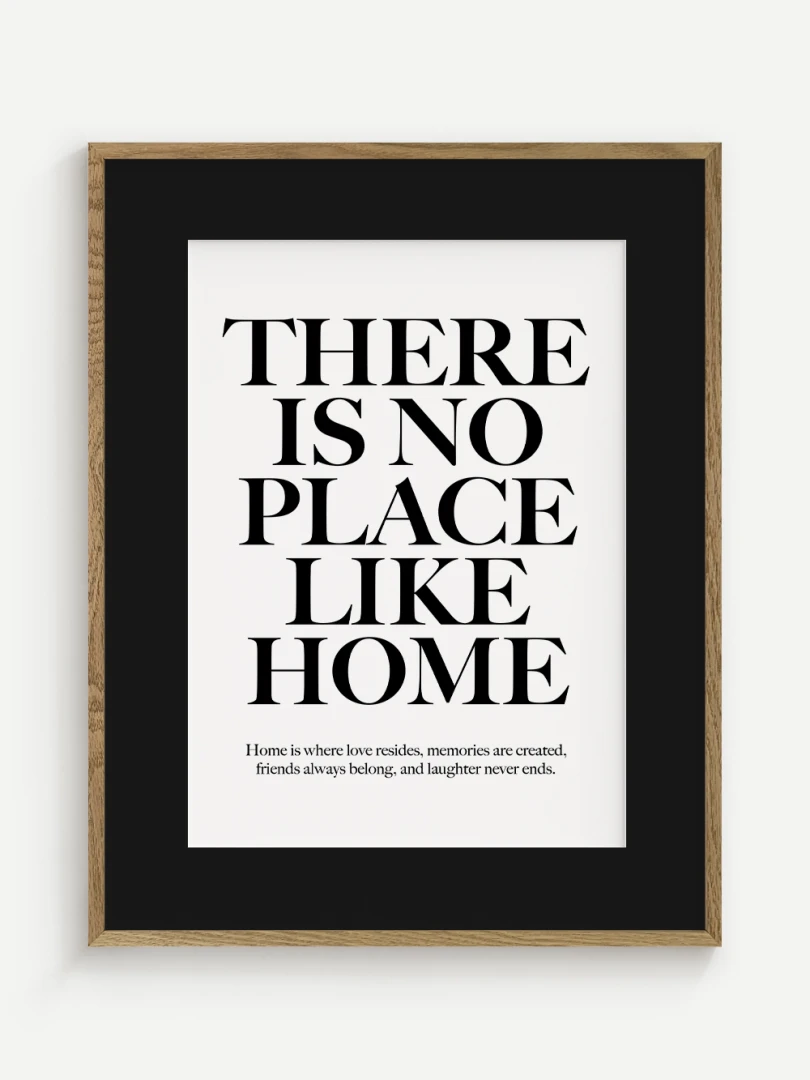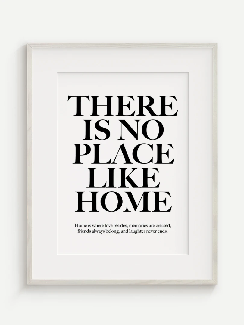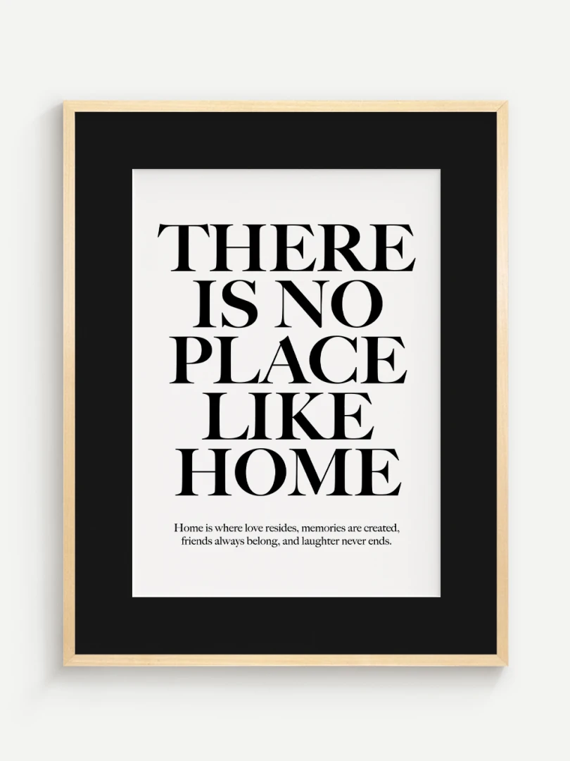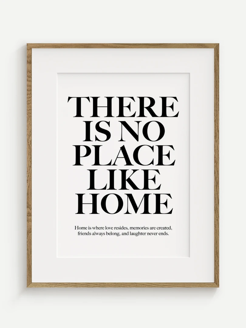 This artistic print carries a timeless truth - There is no place like home. Elegant typography in a contrasting design adds strength and expression to the text, while a subtle complementary quote at the bottom enhances its heart-warming message.