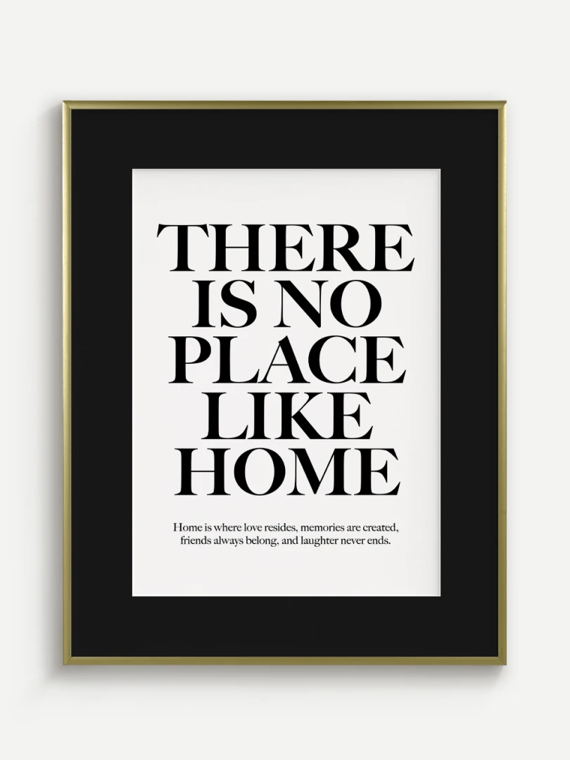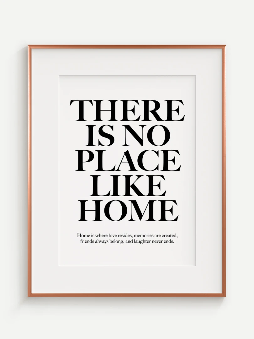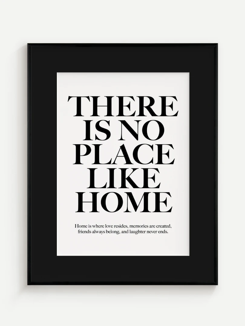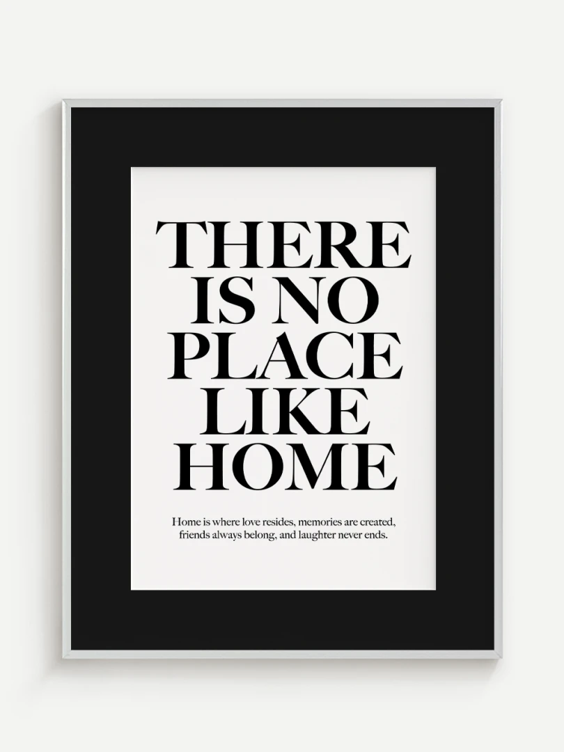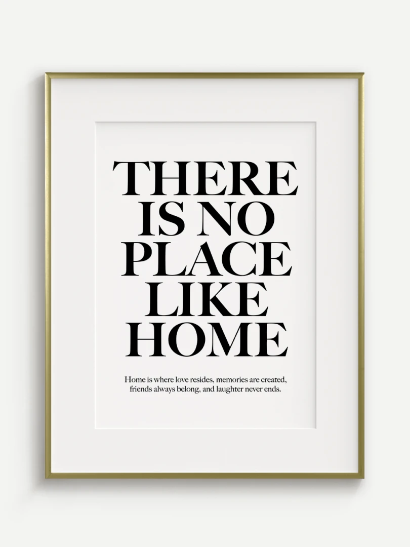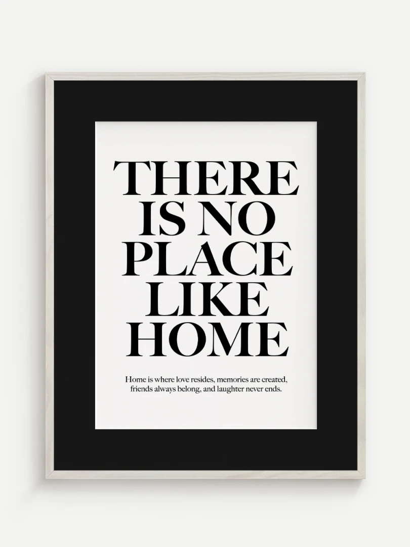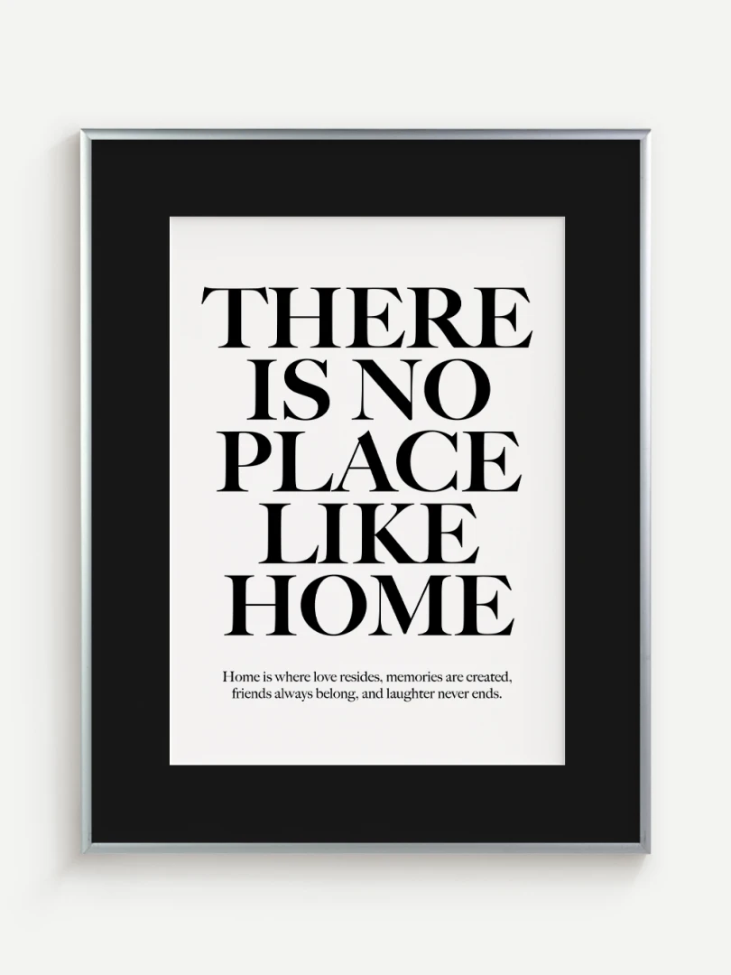 This artistic print carries a timeless truth - There is no place like home. Elegant typography in a contrasting design adds strength and expression to the text, while a subtle complementary quote at the bottom enhances its heart-warming message.