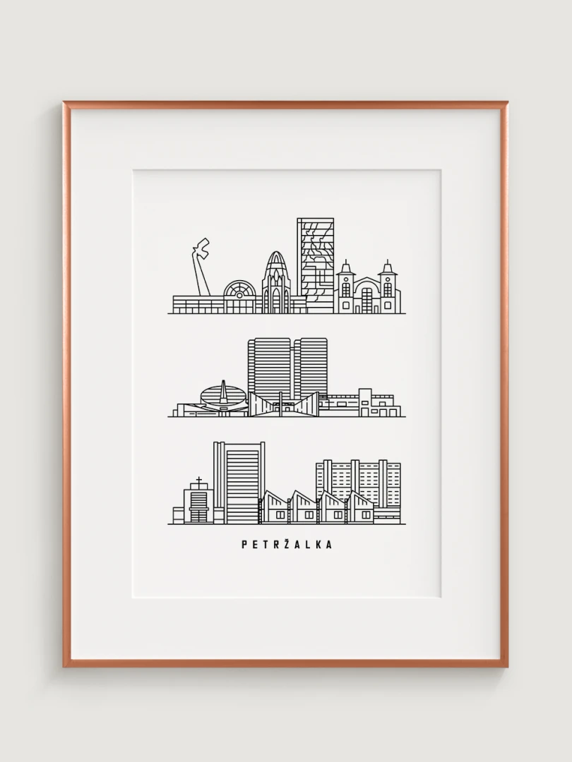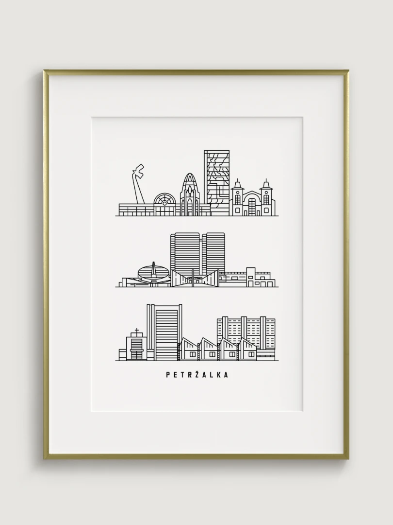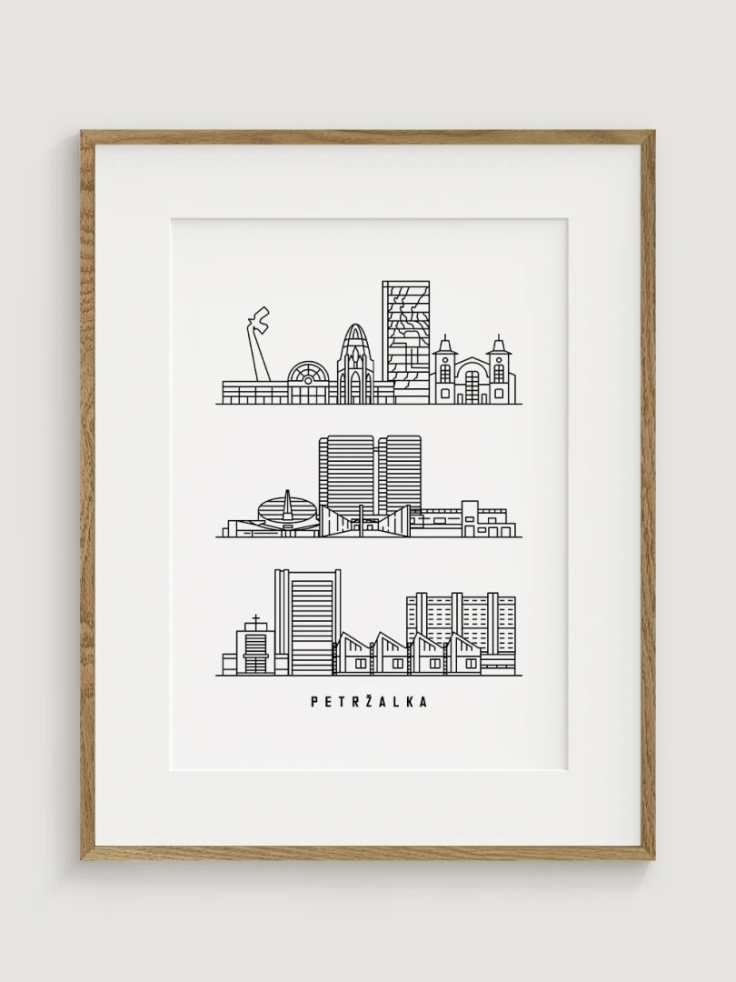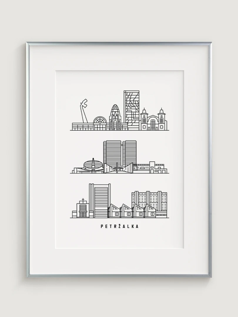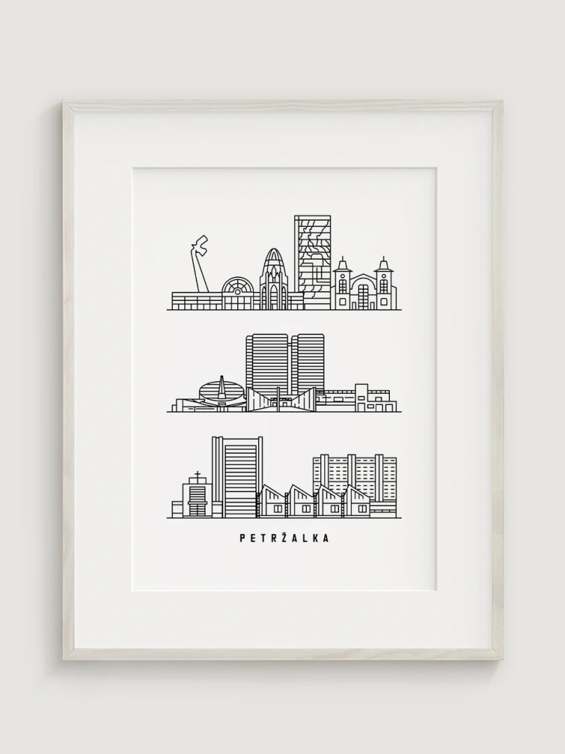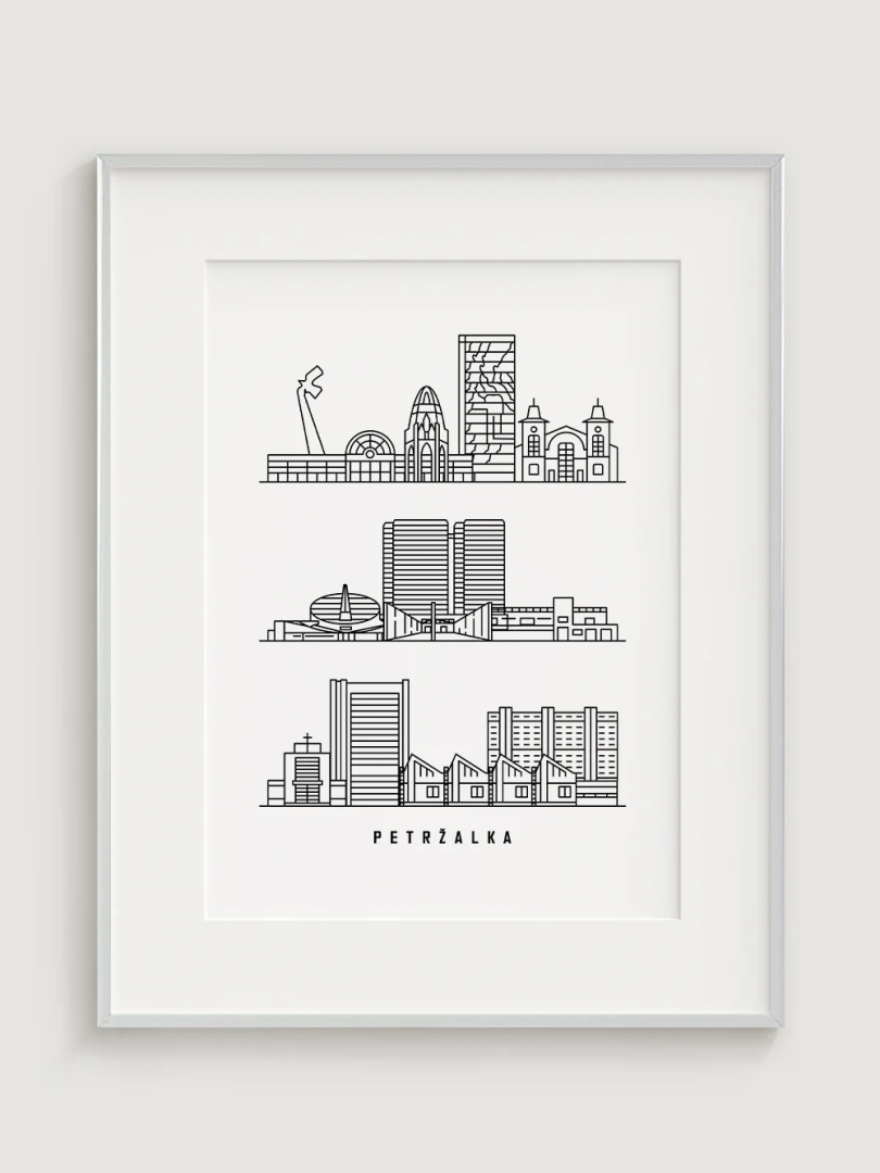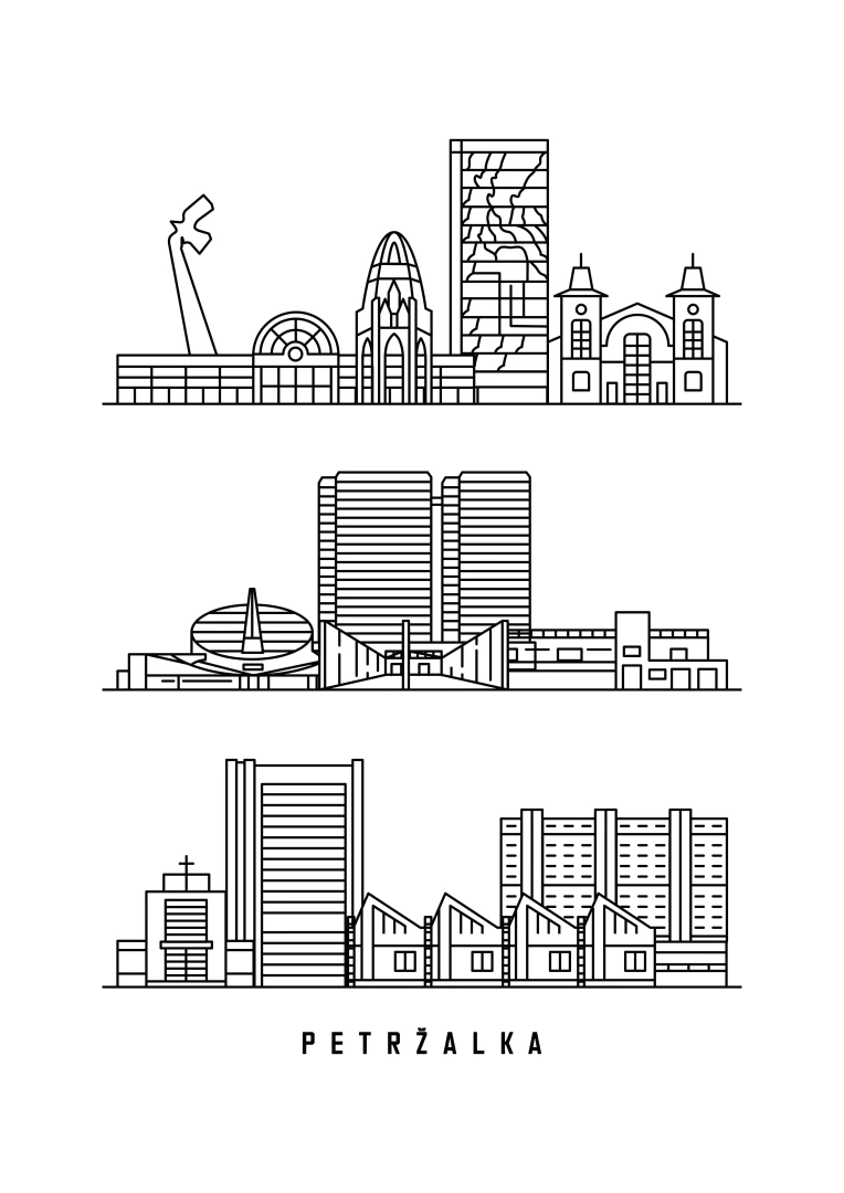 This sleek and stylish piece captures the essence of one of Bratislava's most iconic districts, featuring a blend of historic architecture and modern buildings, all represented in a clean, minimalist line art style.