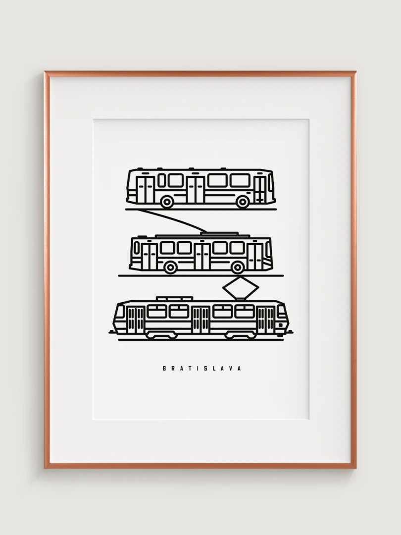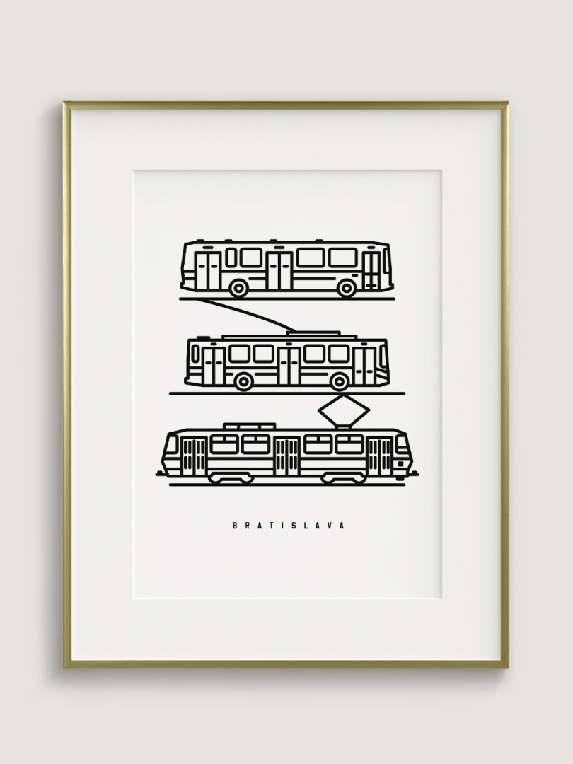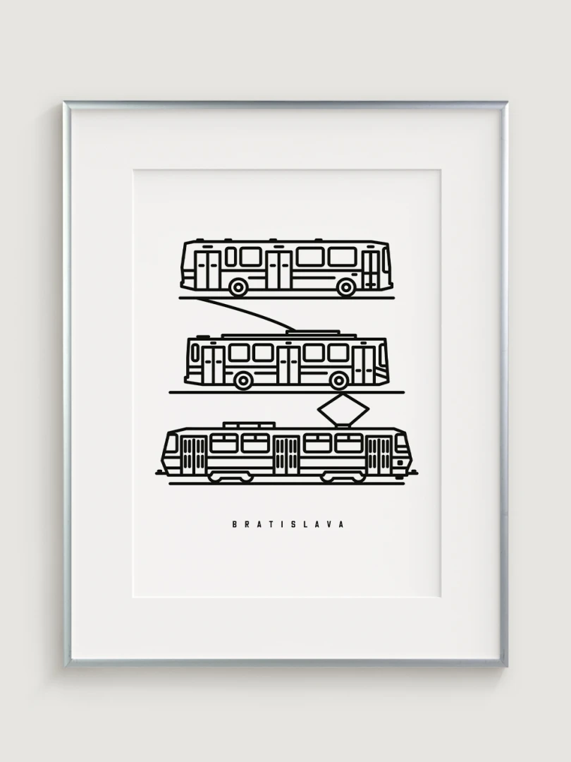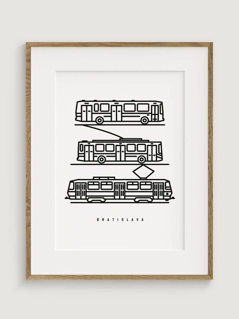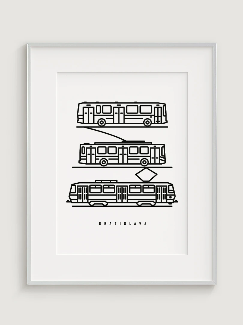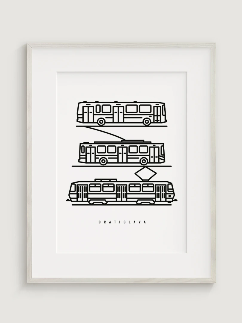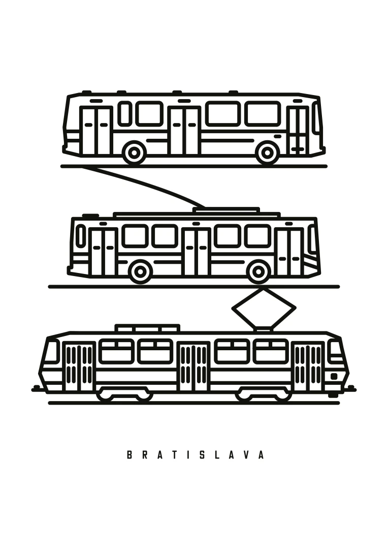 This visually striking piece features a trio of Bratislava’s main transit options: the bus, tram, and trolleybus, each rendered in a minimalist line art style that captures the essence of urban mobility. Printed with sharp, black ink on high-quality paper, this art print offers a stylized, schematic representation that appeals to both transportation enthusiasts and lovers of minimalist design.