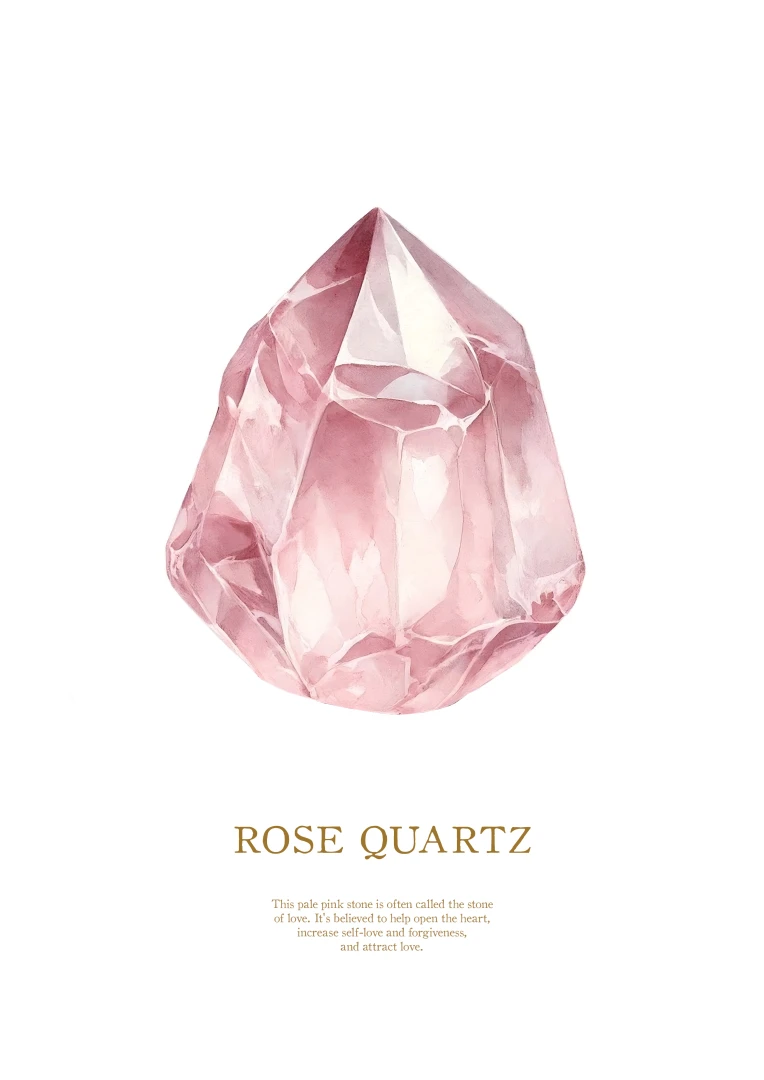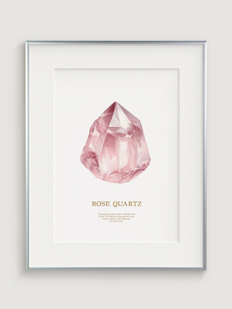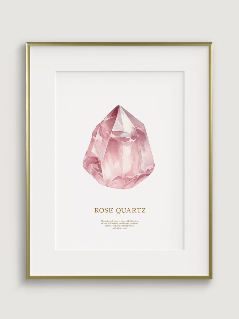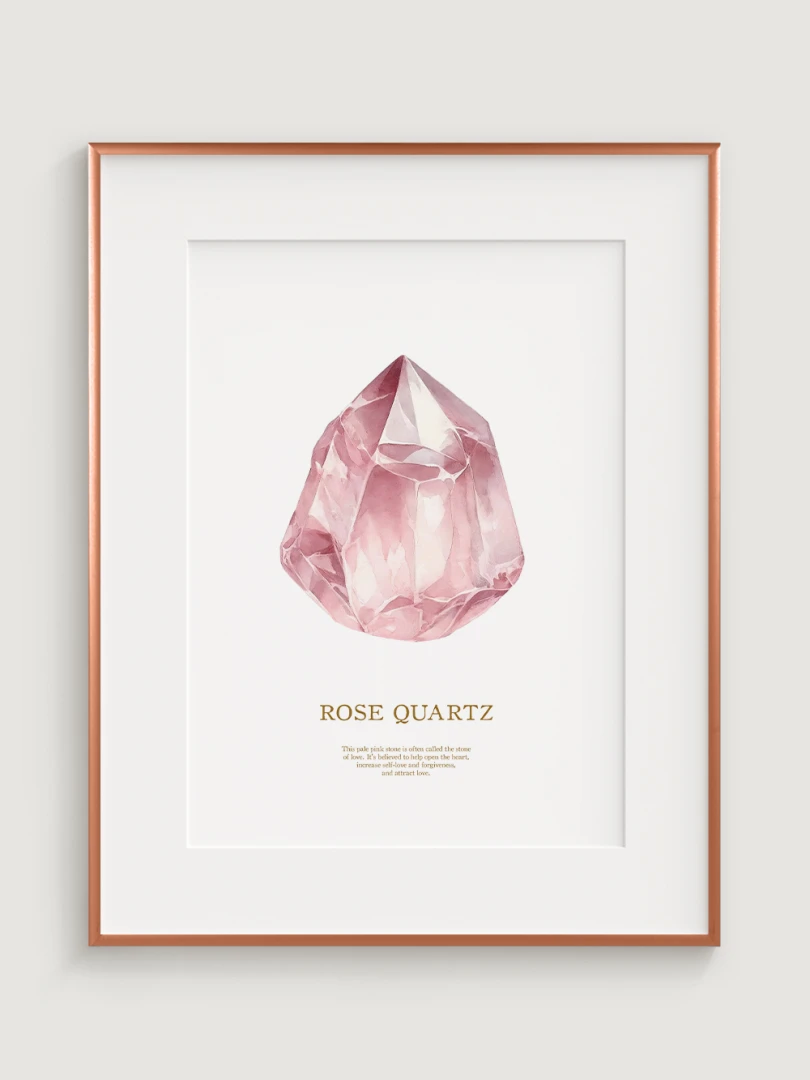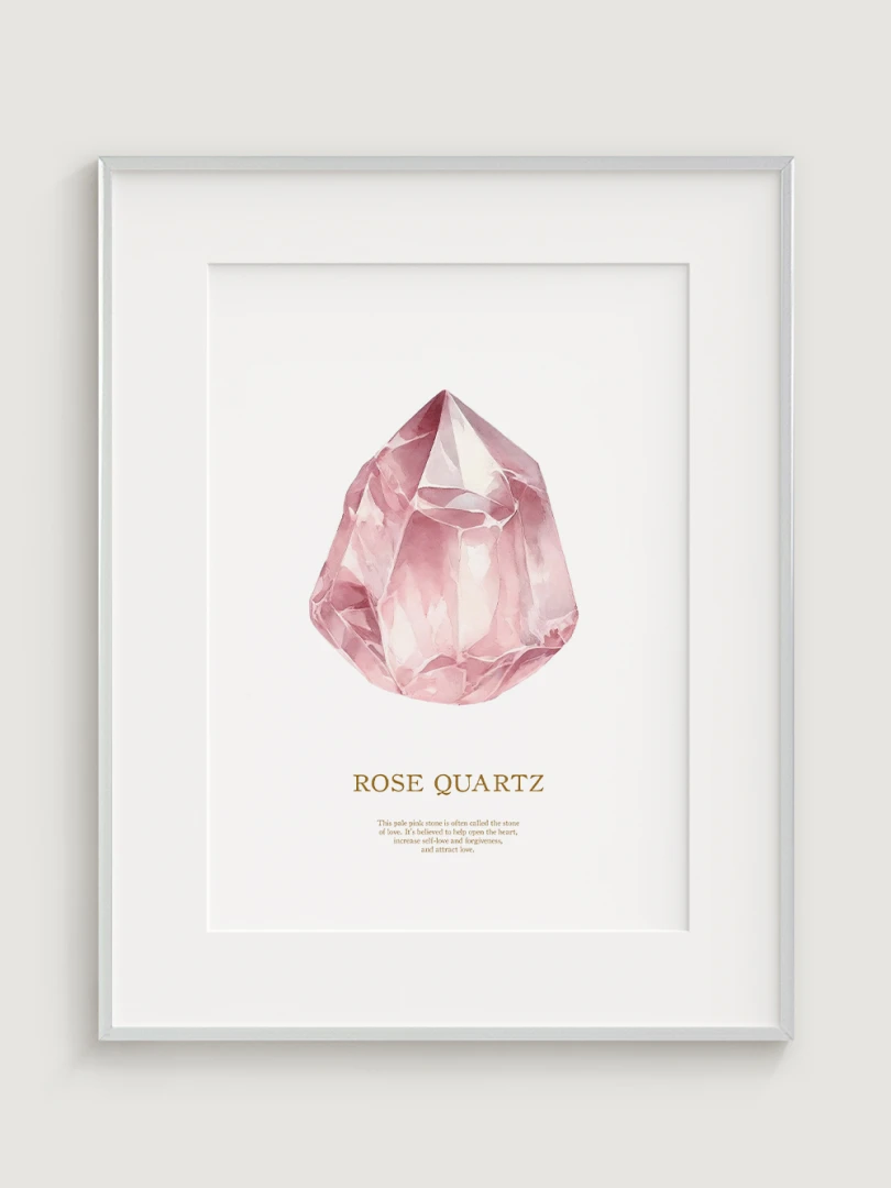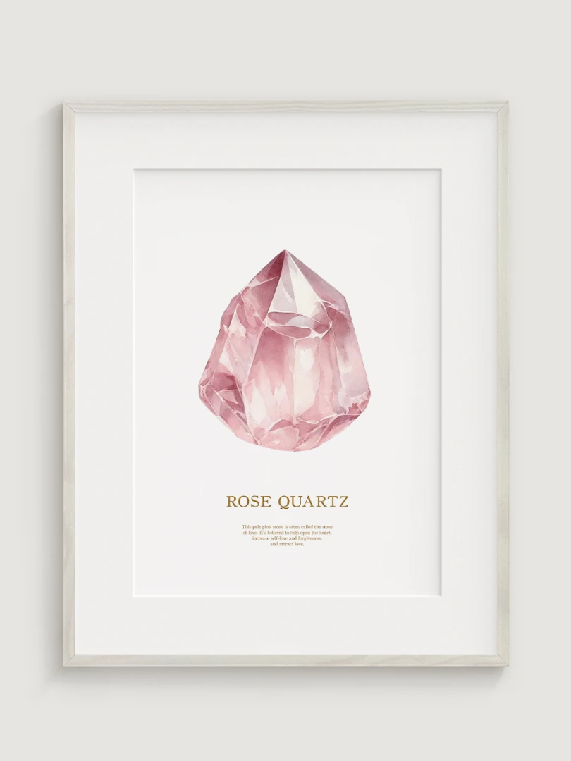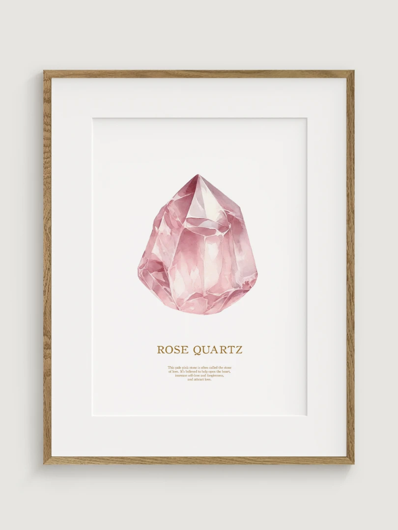 This striking print depicts the soft, rosy tones of rose quartz, which is known for its healing and endearing properties. Perfect for adding a touch of subtle elegance to any room, this print captures the stone's purported abilities to bring love, harmony and inner peace.