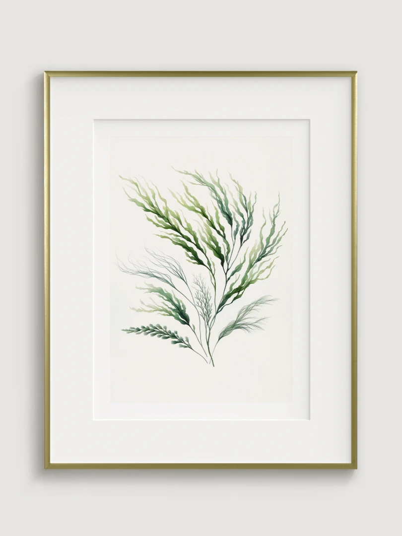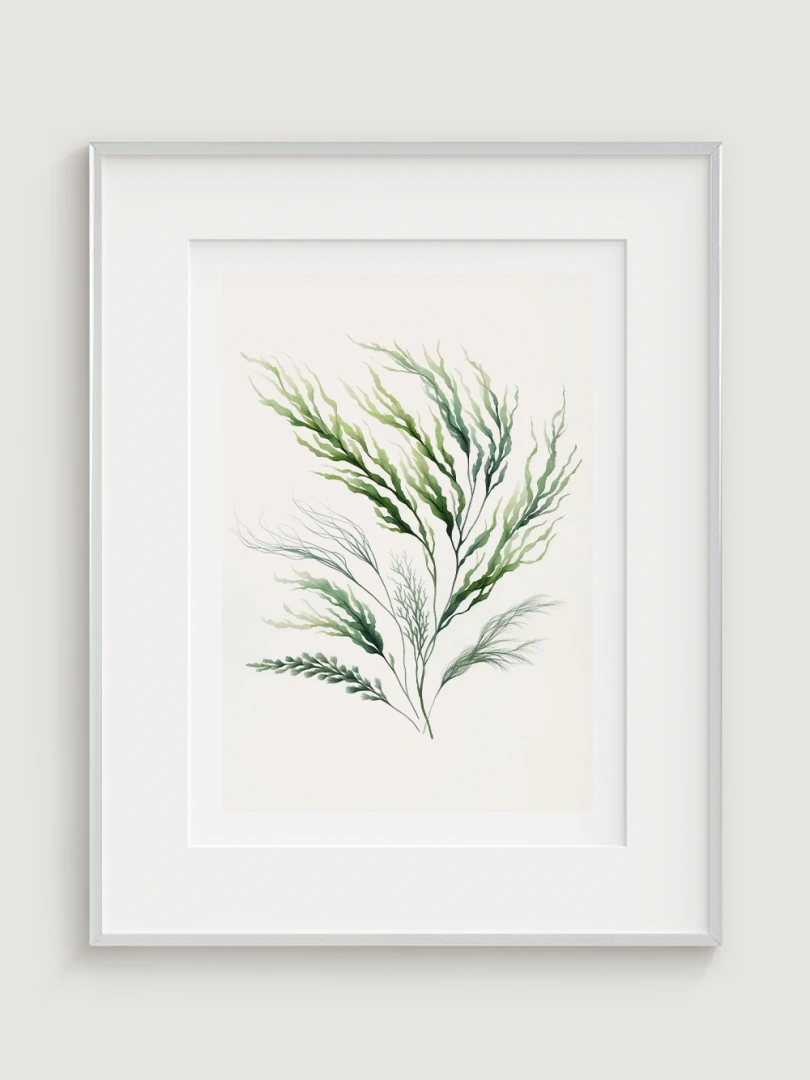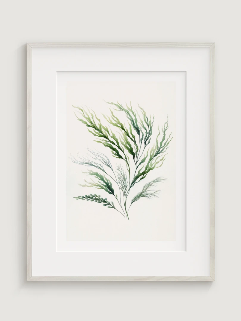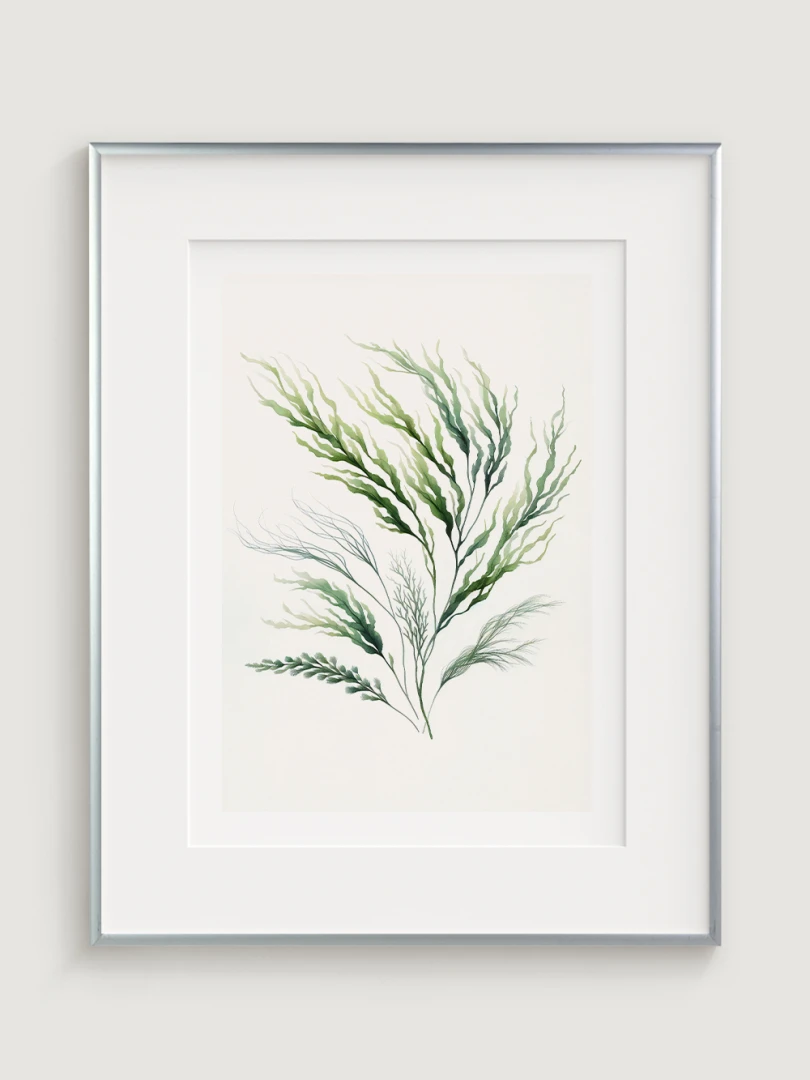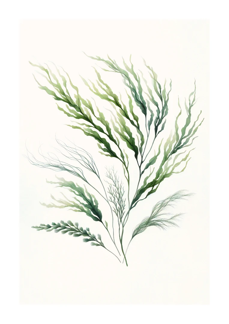 This piece features an elegant depiction of seaweed, with flowing lines and vibrant green hues that capture the organic, undulating forms of underwater plant life.