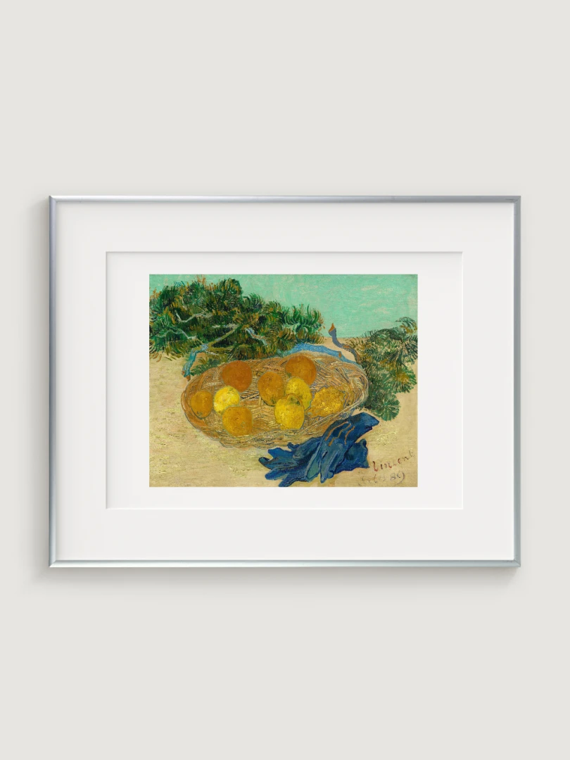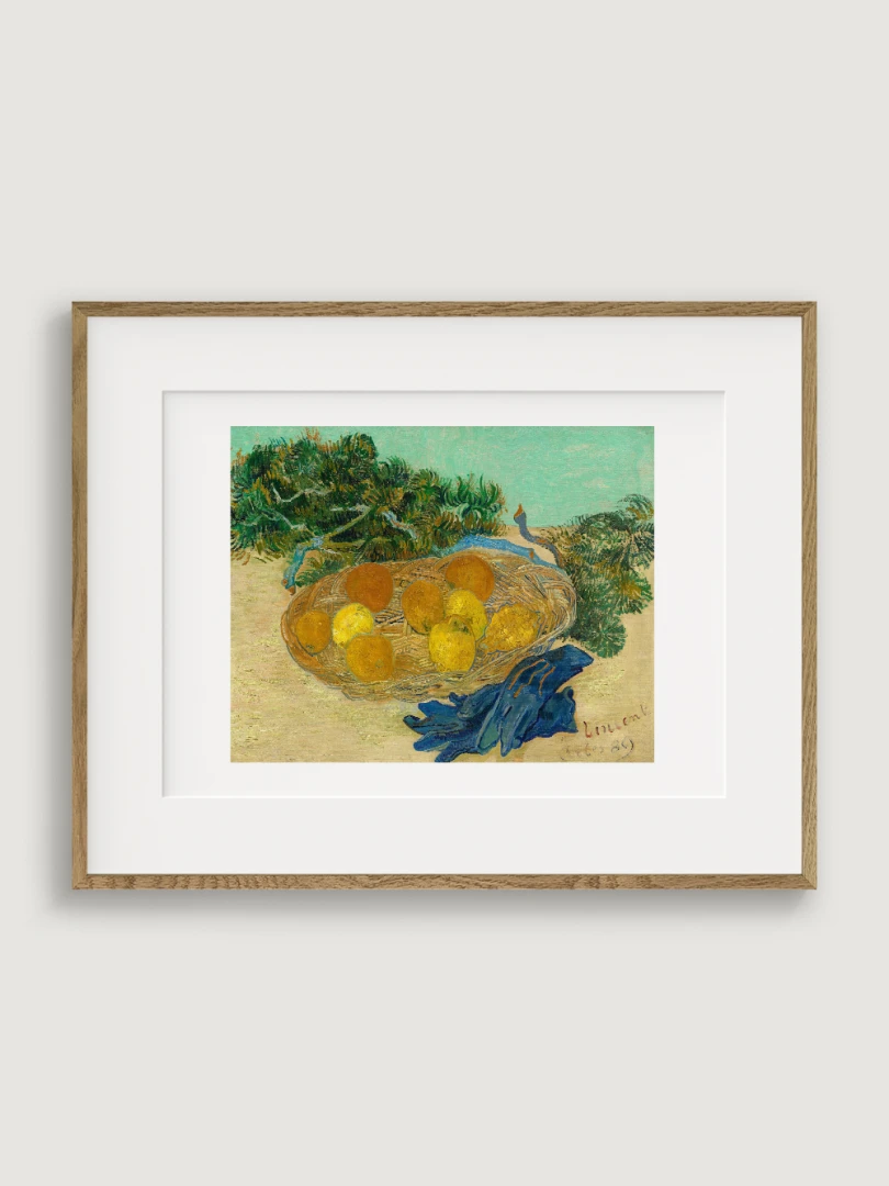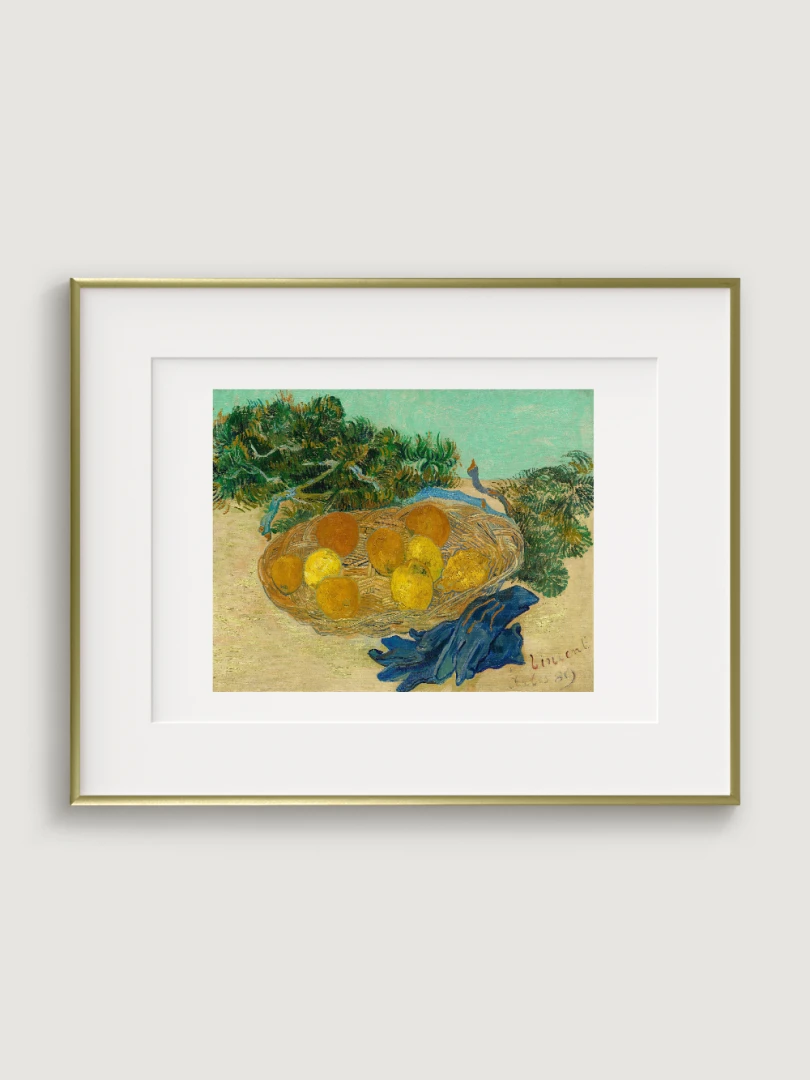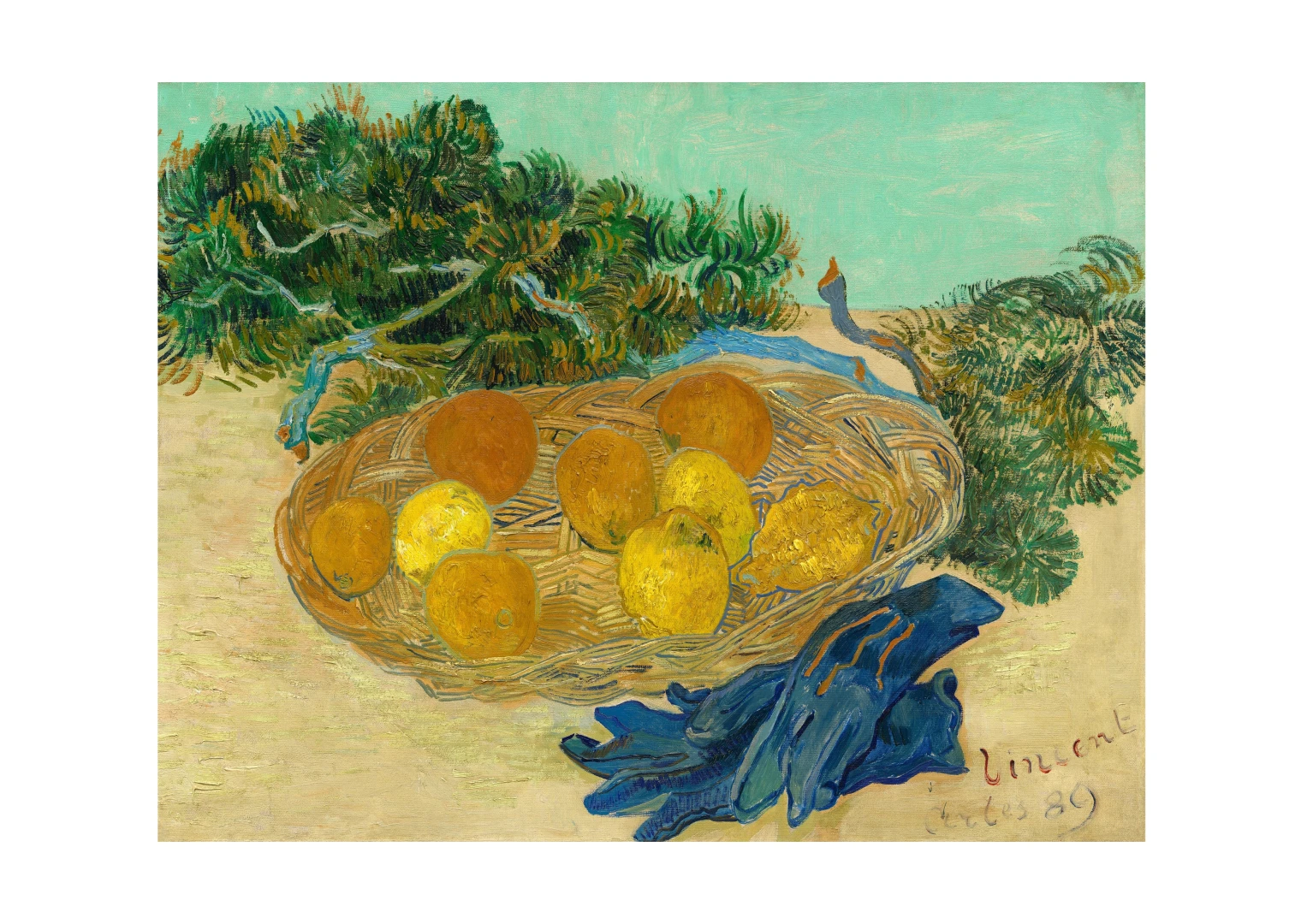 Introducing this gorgeous art print titled "Still Life with Oranges and Lemons with Blue Gloves" by legendary Dutch artist Vincent van Gogh.