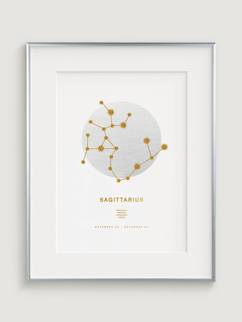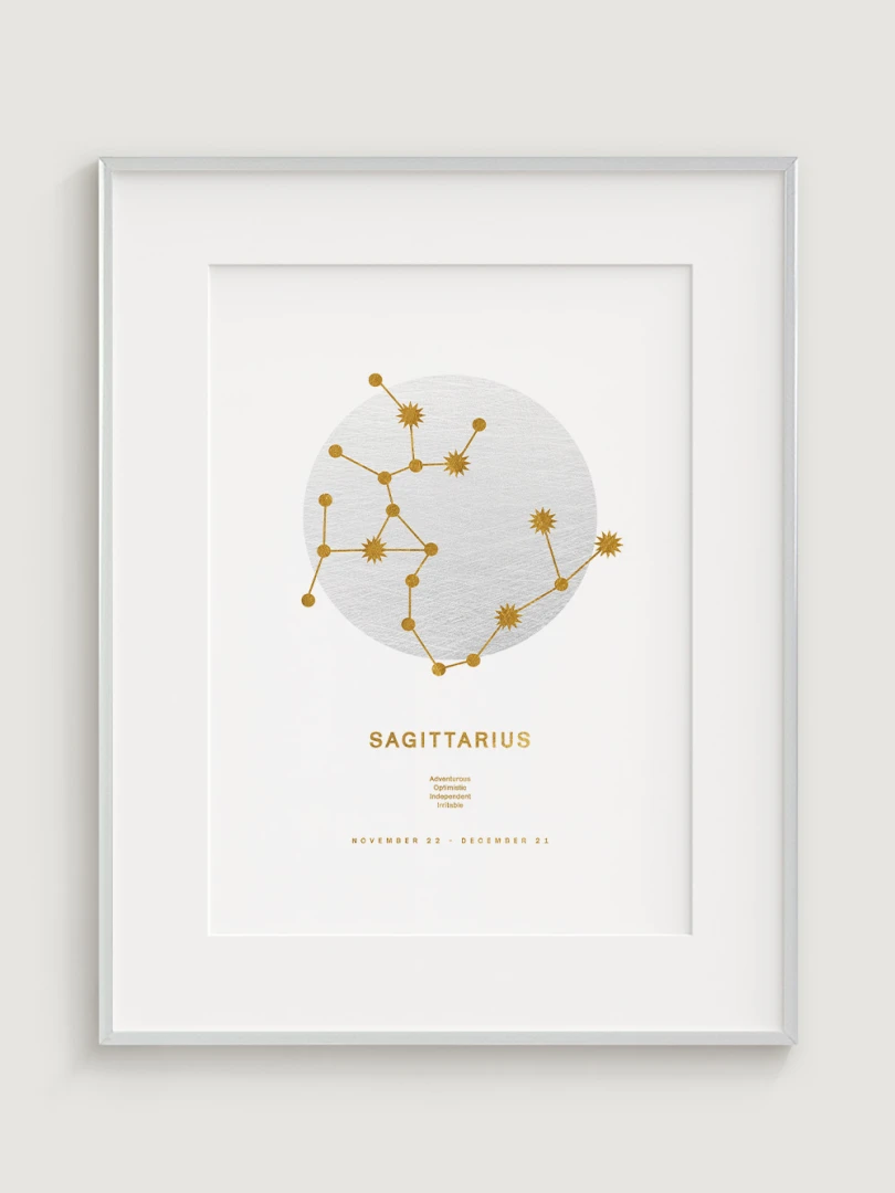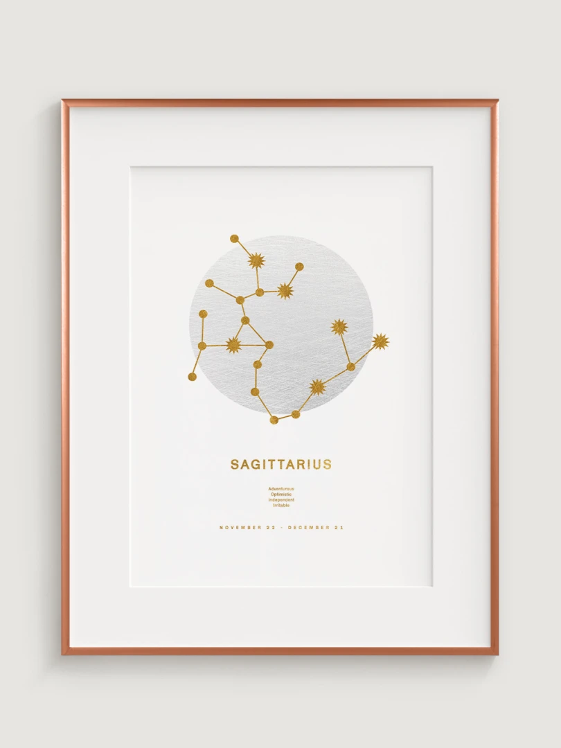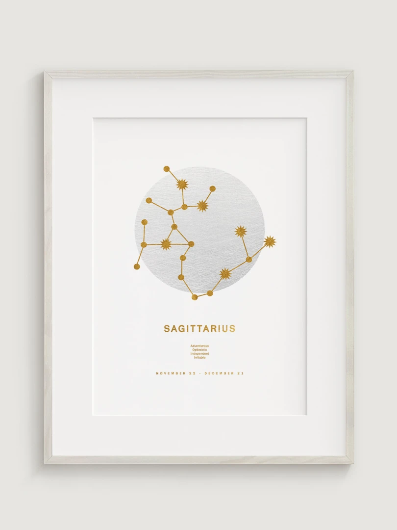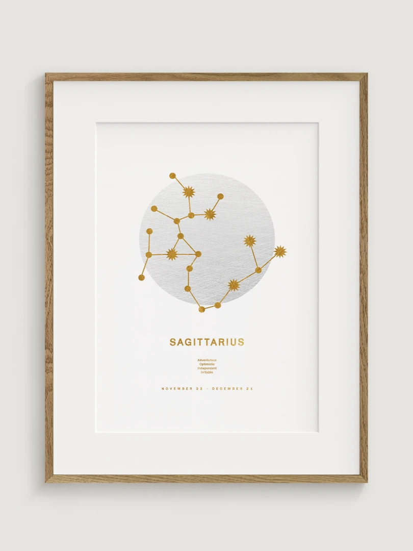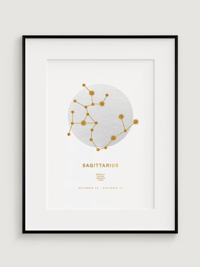 This zodiac sign is known for its adventurous nature, optimism and desire for freedom, which is beautifully illustrated through a minimalist design, fusing modern aesthetics with astrological symbolism. The vibrant yet minimalist palette will bring a touch of personality to any space, making this print the perfect gift for people born under the sign of Sagittarius or a tasteful addition to your home.