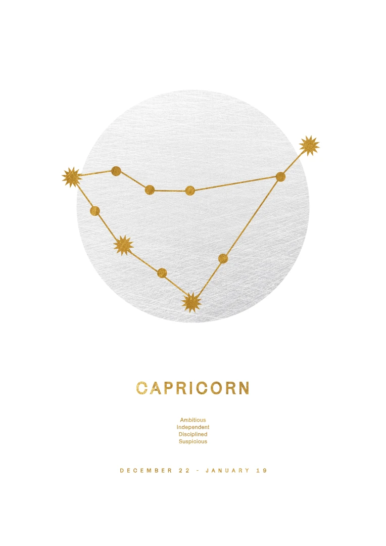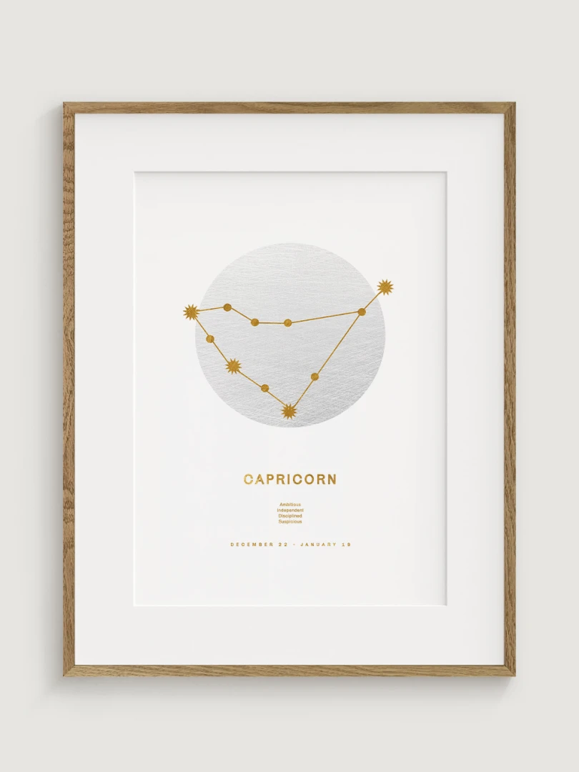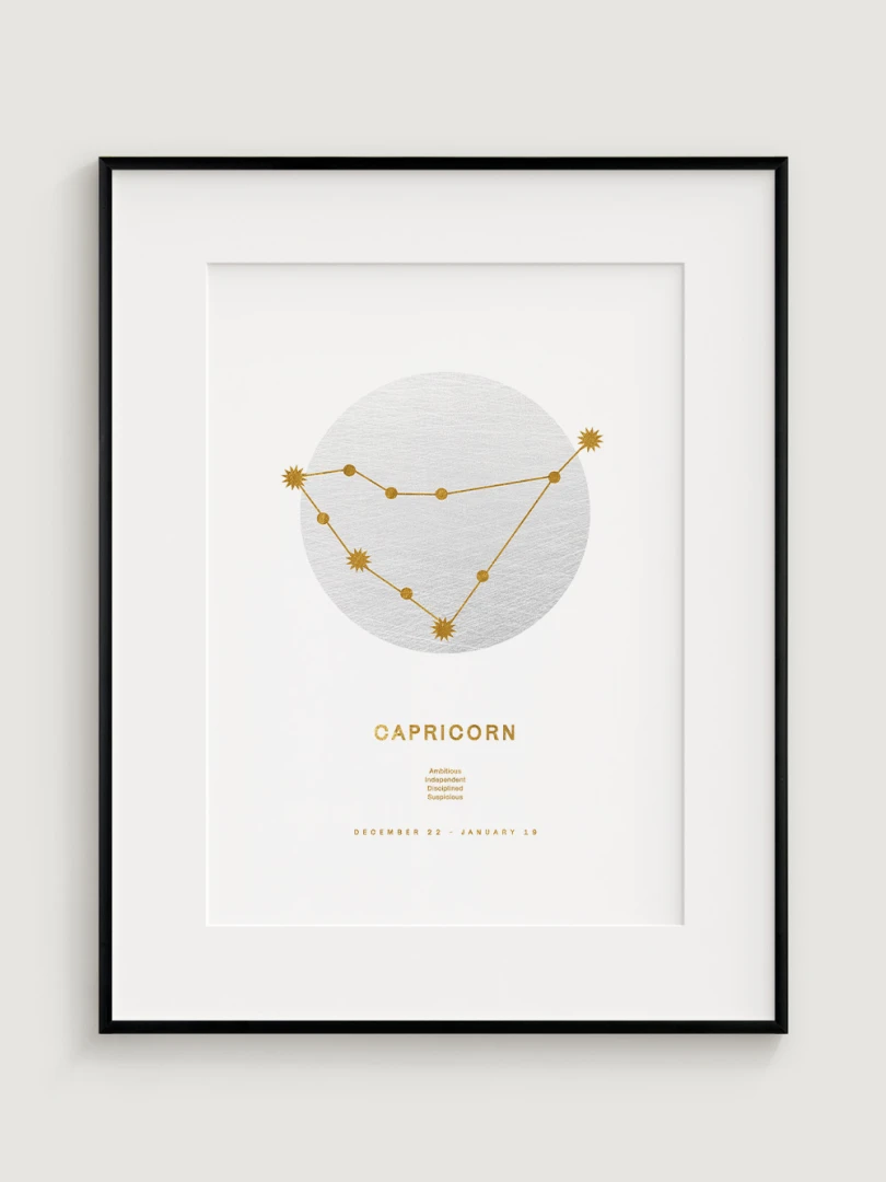 Ideal for those who resonate with the steadfast and resilient qualities of Capricorns or for anyone who appreciates the beauty of astrology. This print serves not only as a decorative piece but also as a celebration of the traits that make Capricorns unique. The golden accents add a touch of luxury and warmth, making it a perfect fit for both modern and traditional decors.