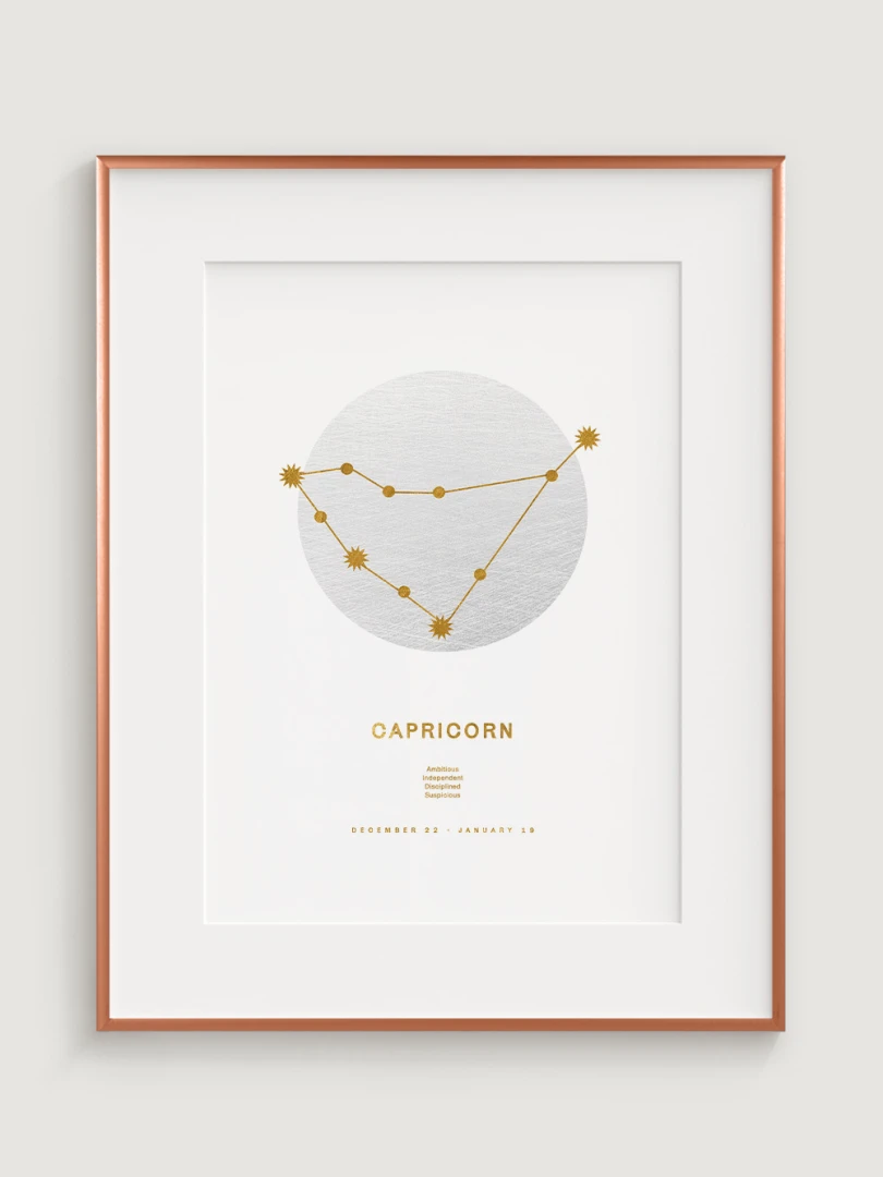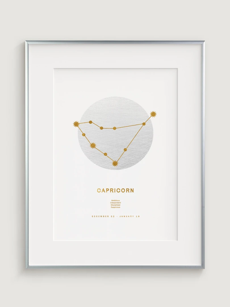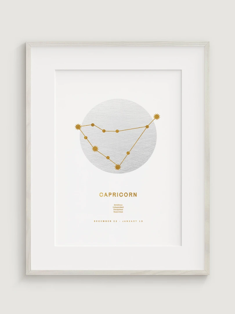 This piece features the constellation of Capricorn depicted in golden lines and stars, set against a subtle textured white background, evoking a sense of sophistication and tranquility. The design beautifully represents the attributes associated with Capricorns—ambition, independence, discipline, and a touch of caution.