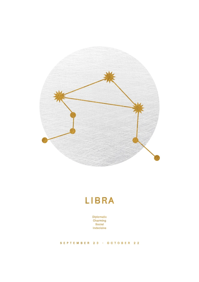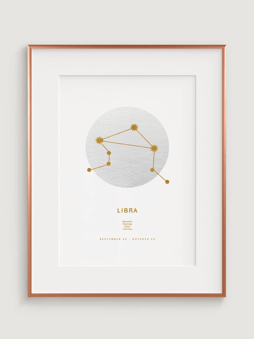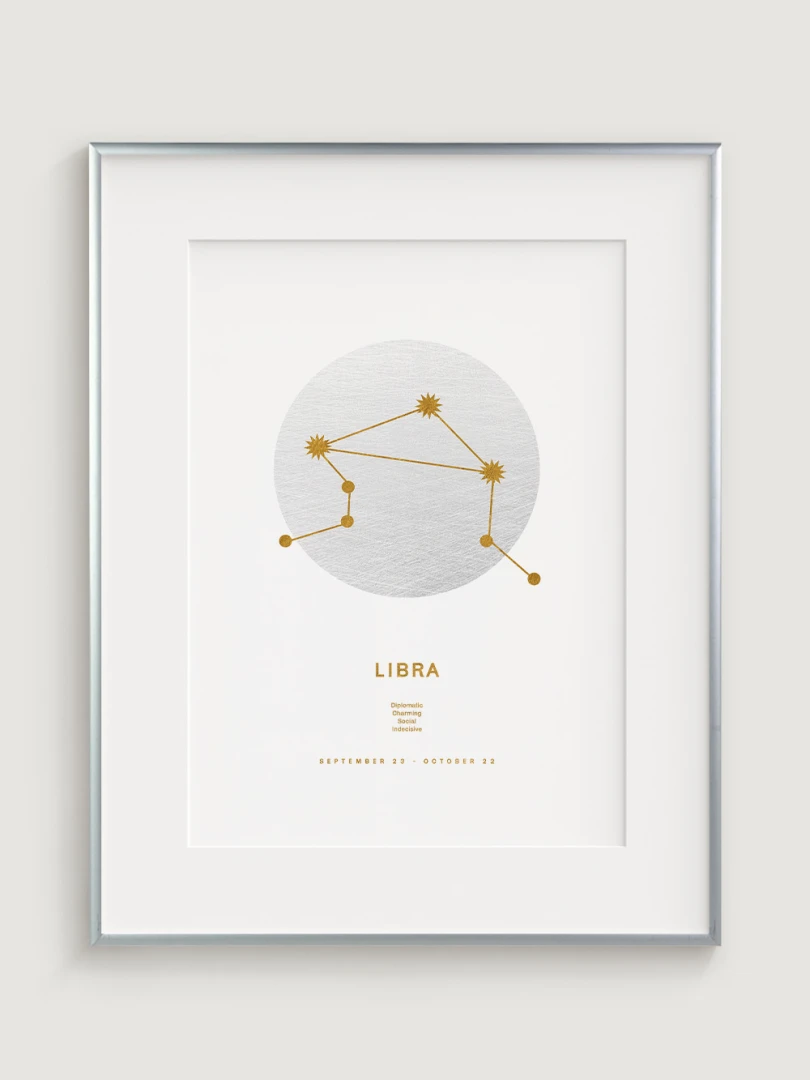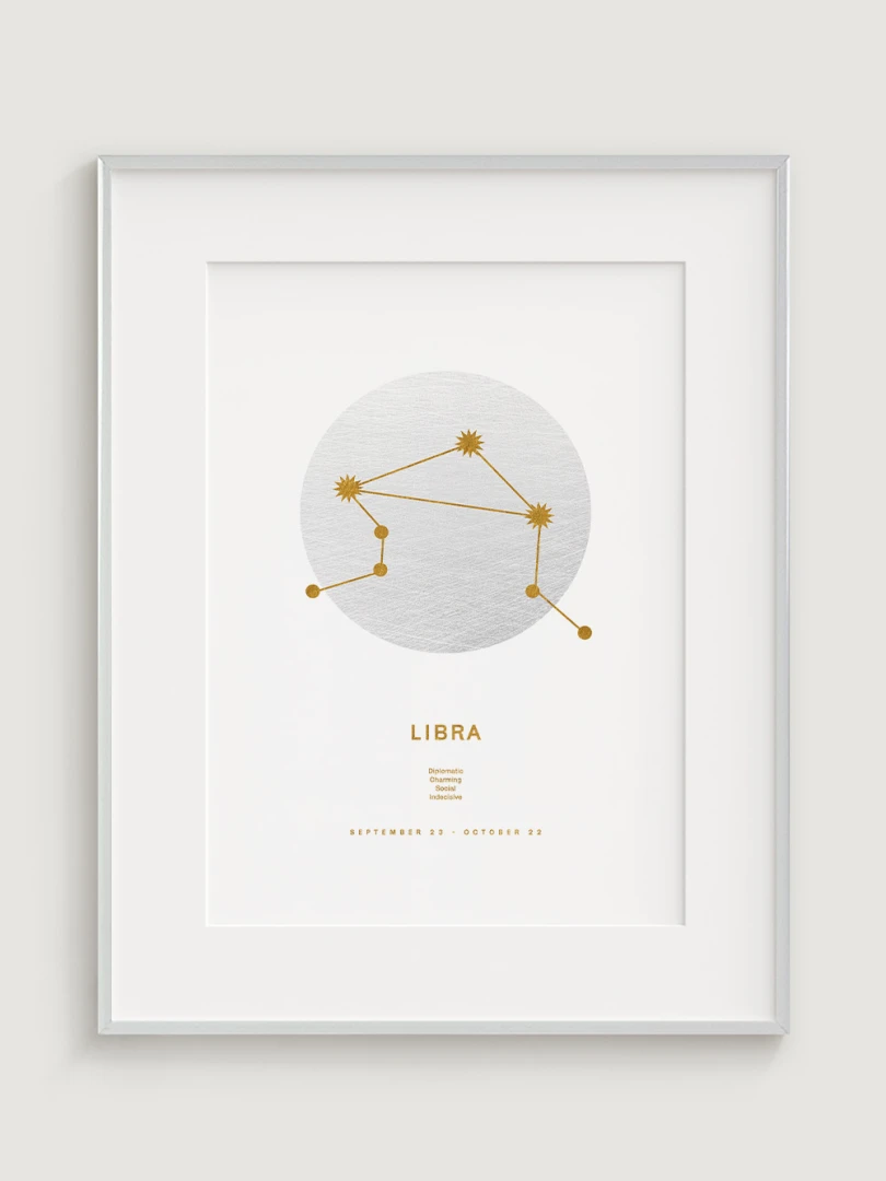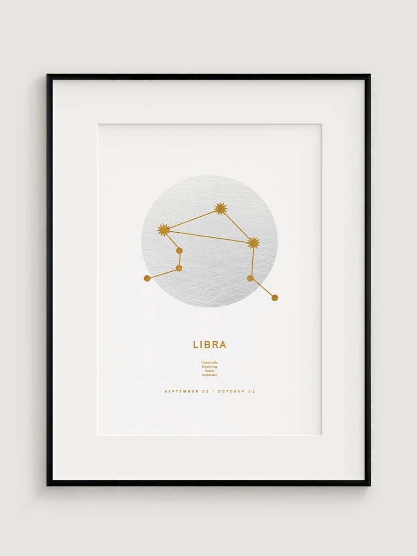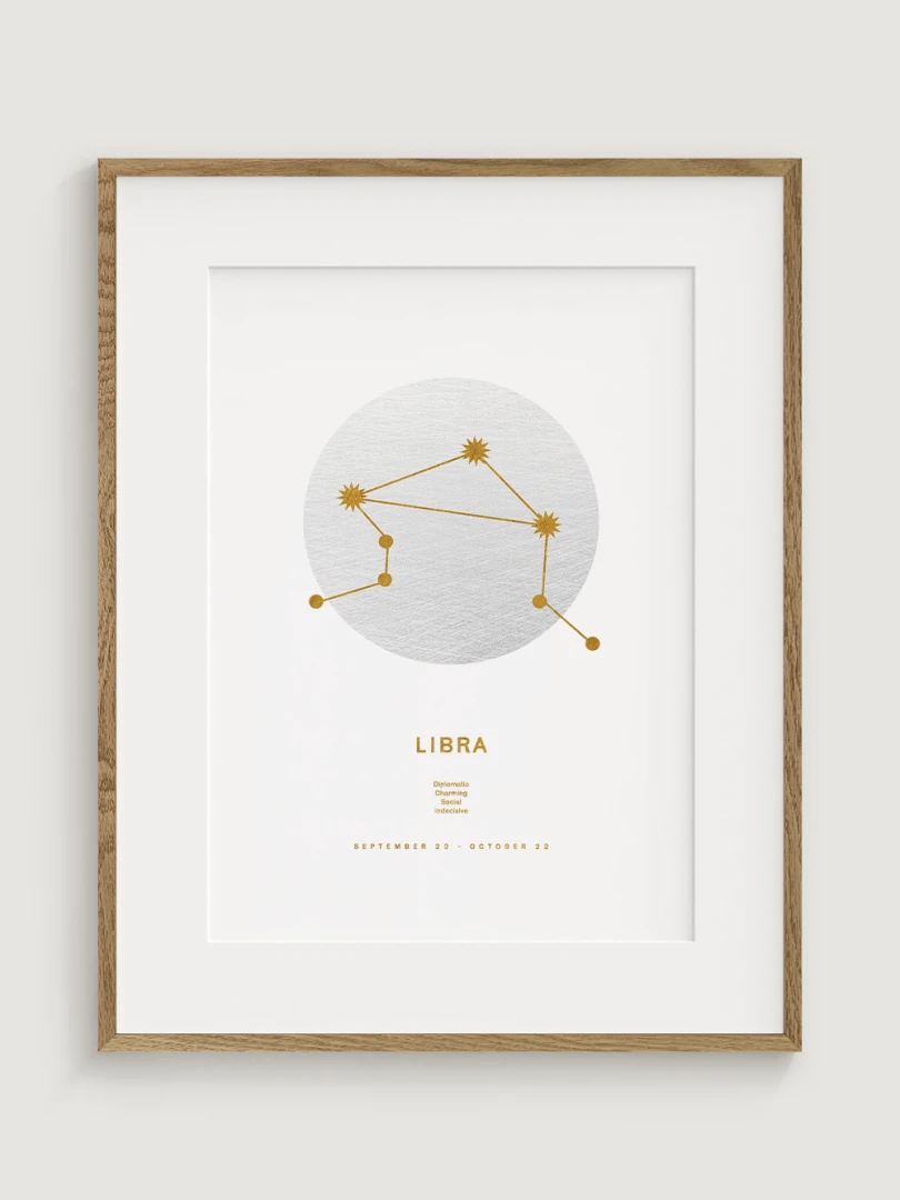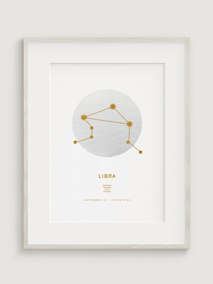 This print is not just a decorative element; it celebrates the harmonious and balanced nature of the Libras, who are known for their sense of justice, diplomacy and aesthetics. The elegant gold design on a white background adds a touch of luxury and makes it a versatile accessory for any style of decor, from modern to classic.