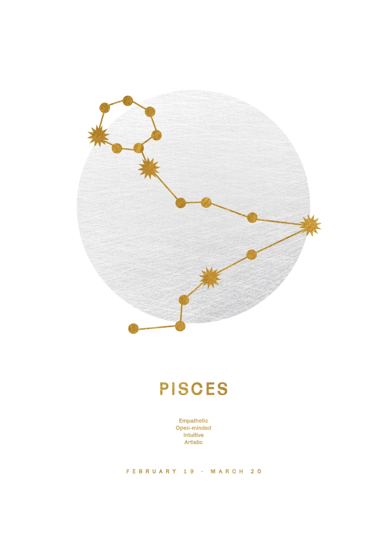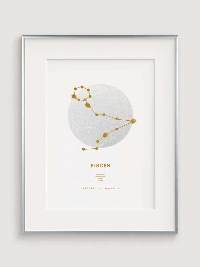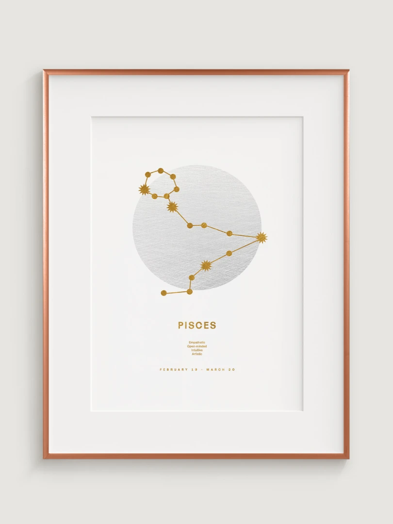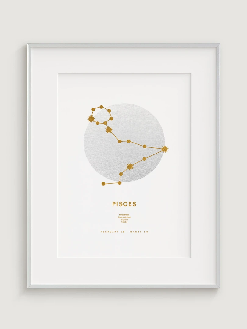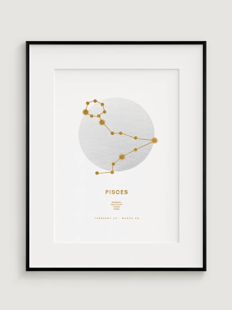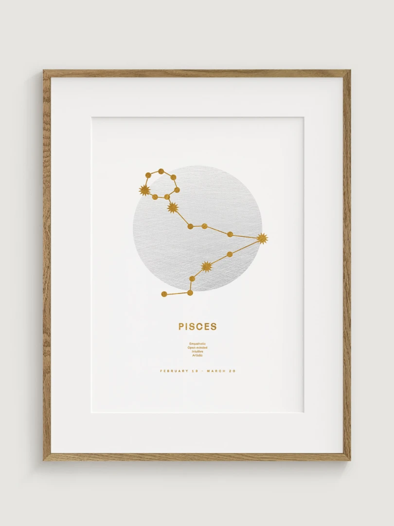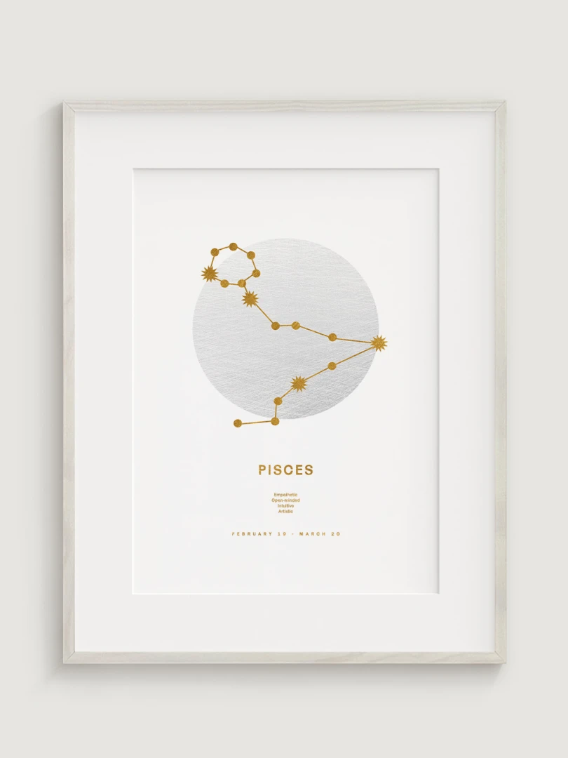 This print features the constellation of Pisces depicted in striking gold against a serene, textured gray circle that symbolizes the vast cosmos. The constellation is interconnected with delicate golden lines, punctuated by starry points that represent the key stars of this astrological sign.