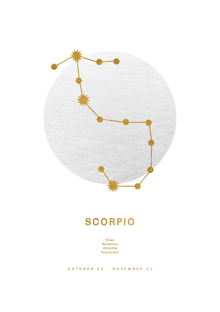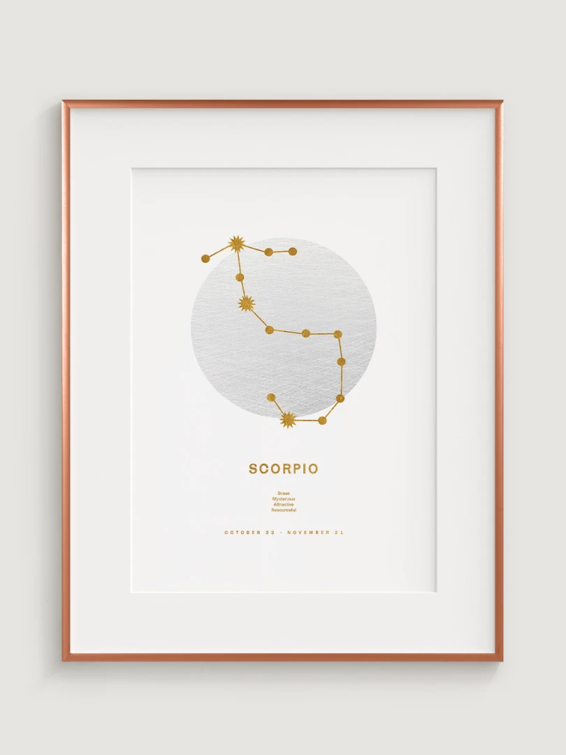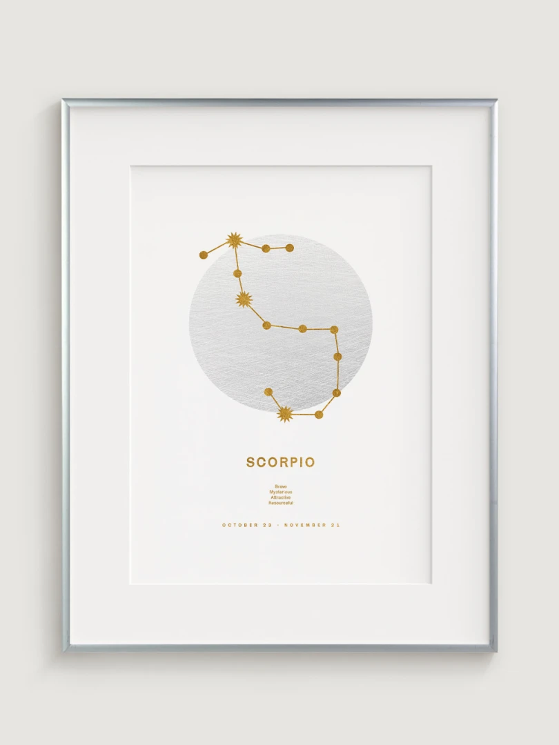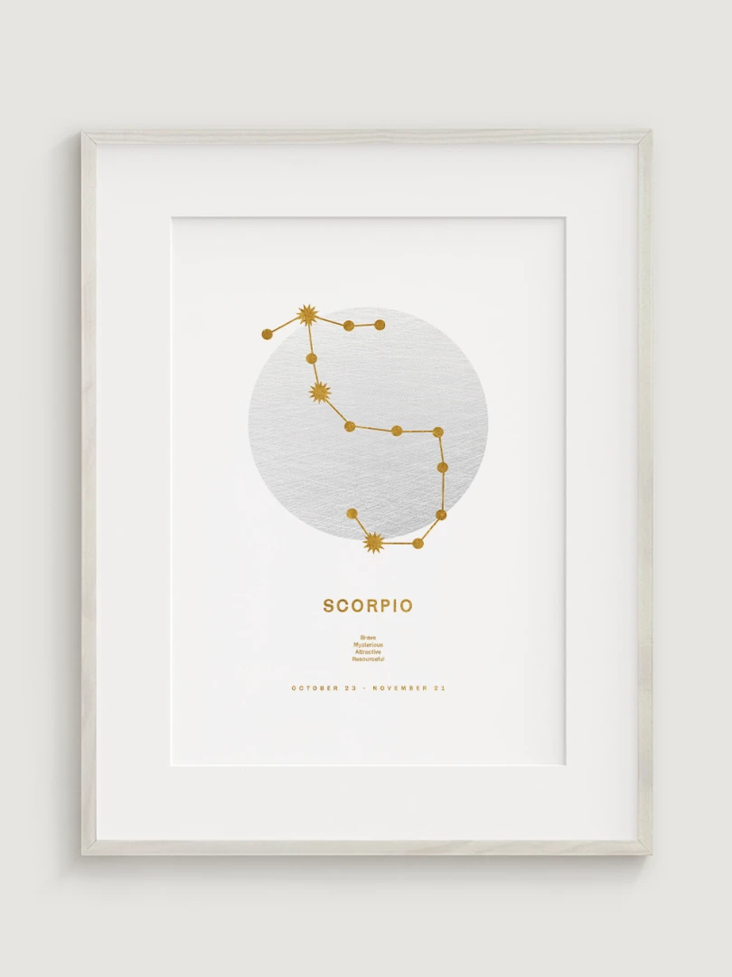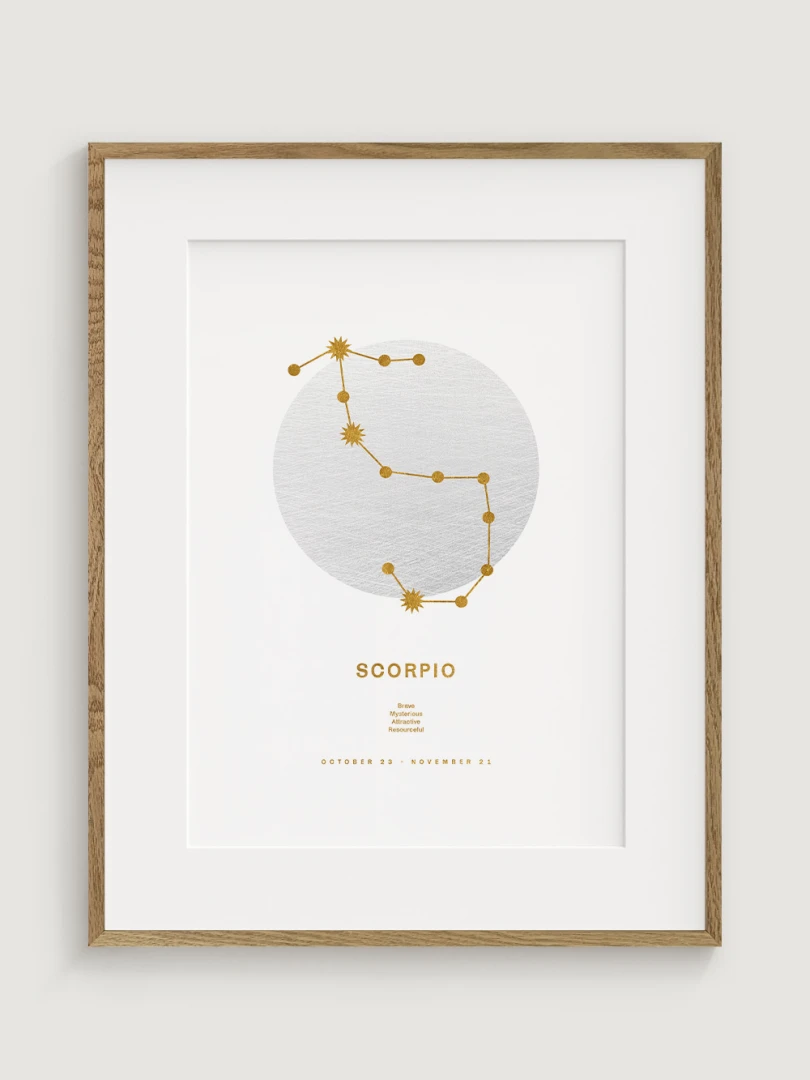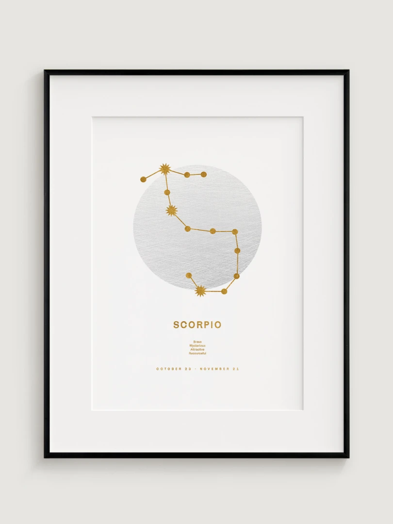 This zodiac sign is known for its intensity, deep emotions and ability to transform, which is beautifully illustrated through a minimalist design, fusing modern aesthetics with astrological symbolism. The subtle and minimalist palette will add a calming atmosphere to any space, making this print the perfect gift for people born under the sign of Scorpio or a stylish addition to your home.