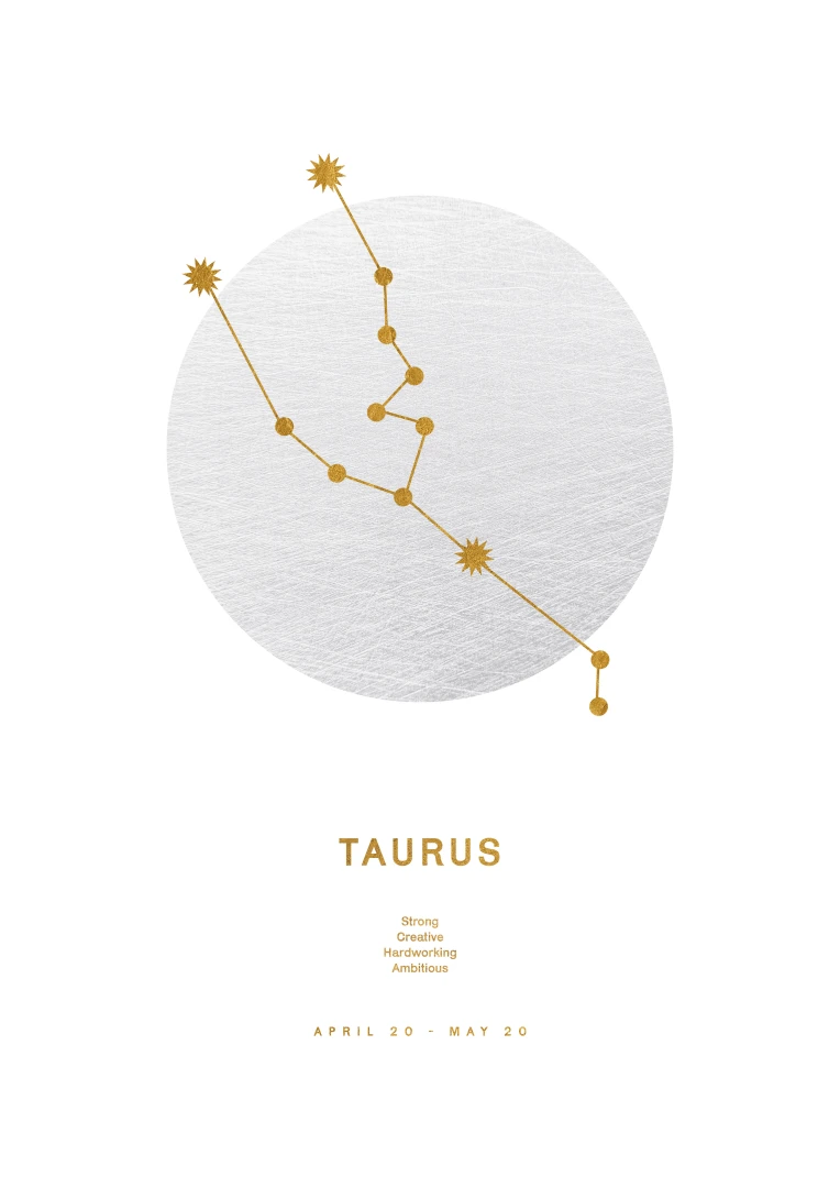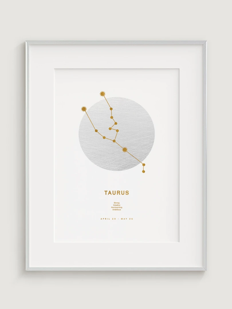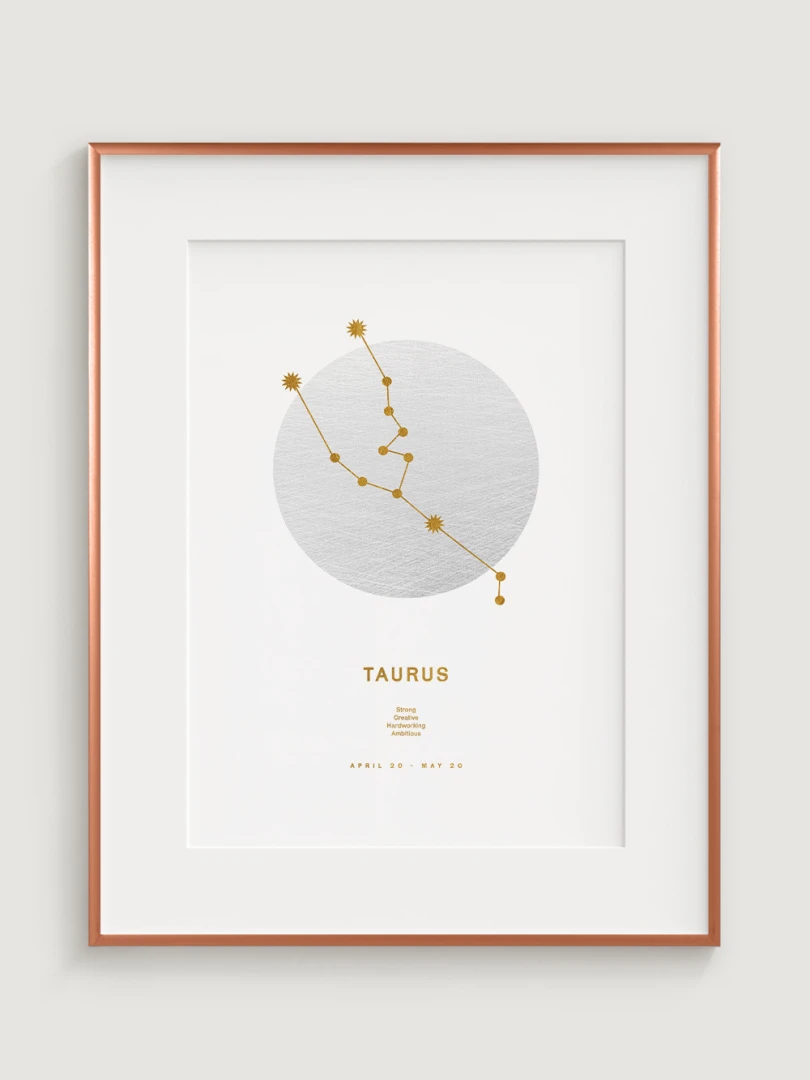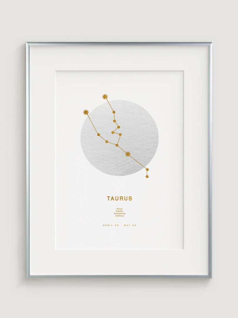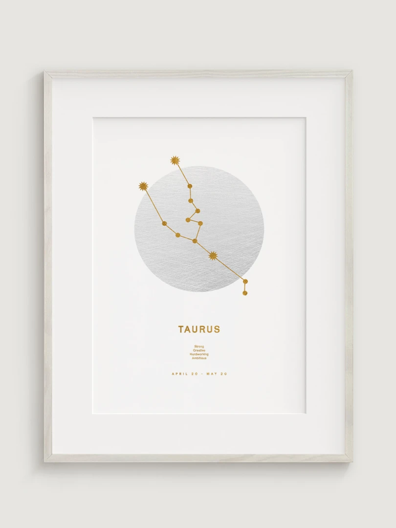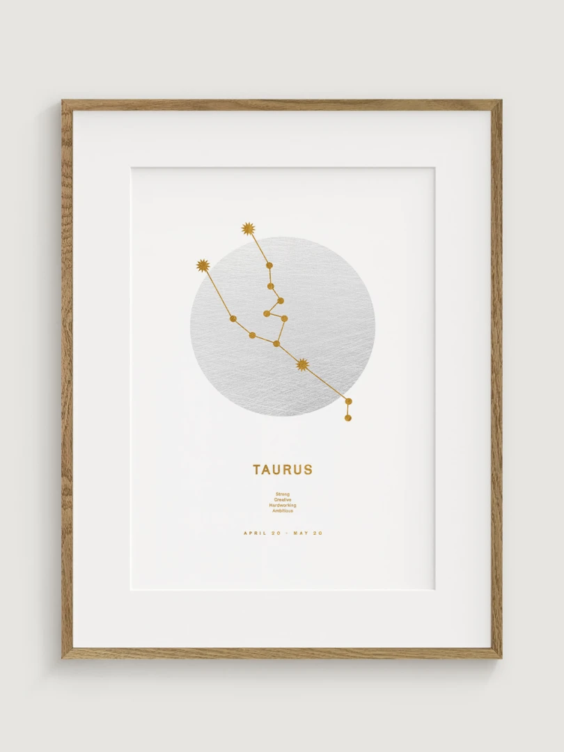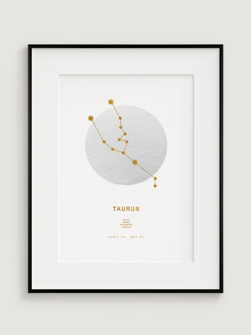 Perfect for those who appreciate astrology or are looking to personalize their space with star sign-themed decor, this print captures the essence of Taurus, which is known for being strong, dependable, and ambitious. Below the constellation, the print includes the word "Taurus" followed by traits synonymous with the sign: "Strong, Perseverating, Ambitious," along with the date range from April 20 to May 20, making it a thoughtful gift or personal keepsake.